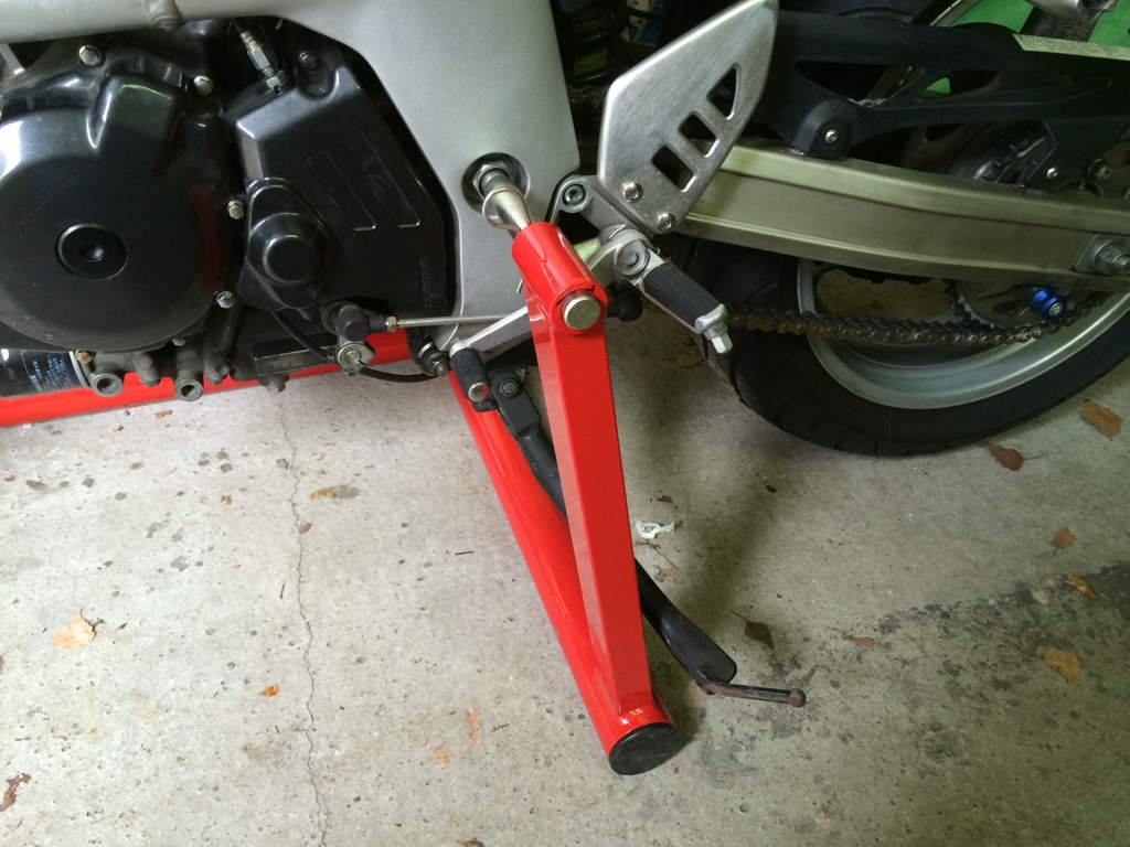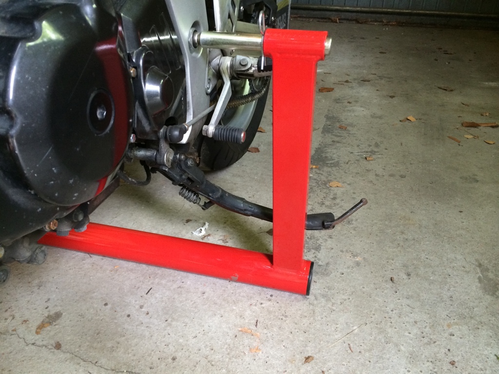 Beim Aufbocken liegt der Montageständer ganz leicht am ausgeklappten Seitenständer an,funktioniert aber ansonsten völlig unproblematisch.