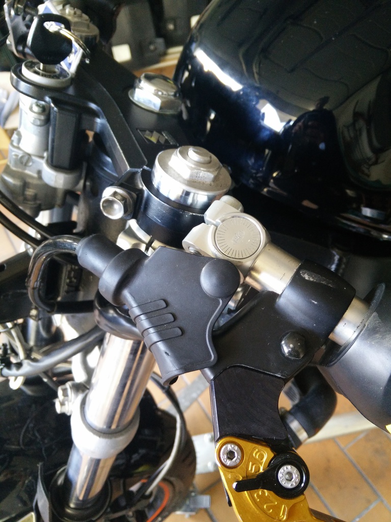 Soo, habe gestern mit Dieter von 9:00 - 13:30 Uhr in seiner Werkstatt rumgeschraubt und haben jetzt wieder den Stummellenker montiert, die originalen Knochen verbaut, die Gabel durchgestreckt und den MIVV Oval eingebaut