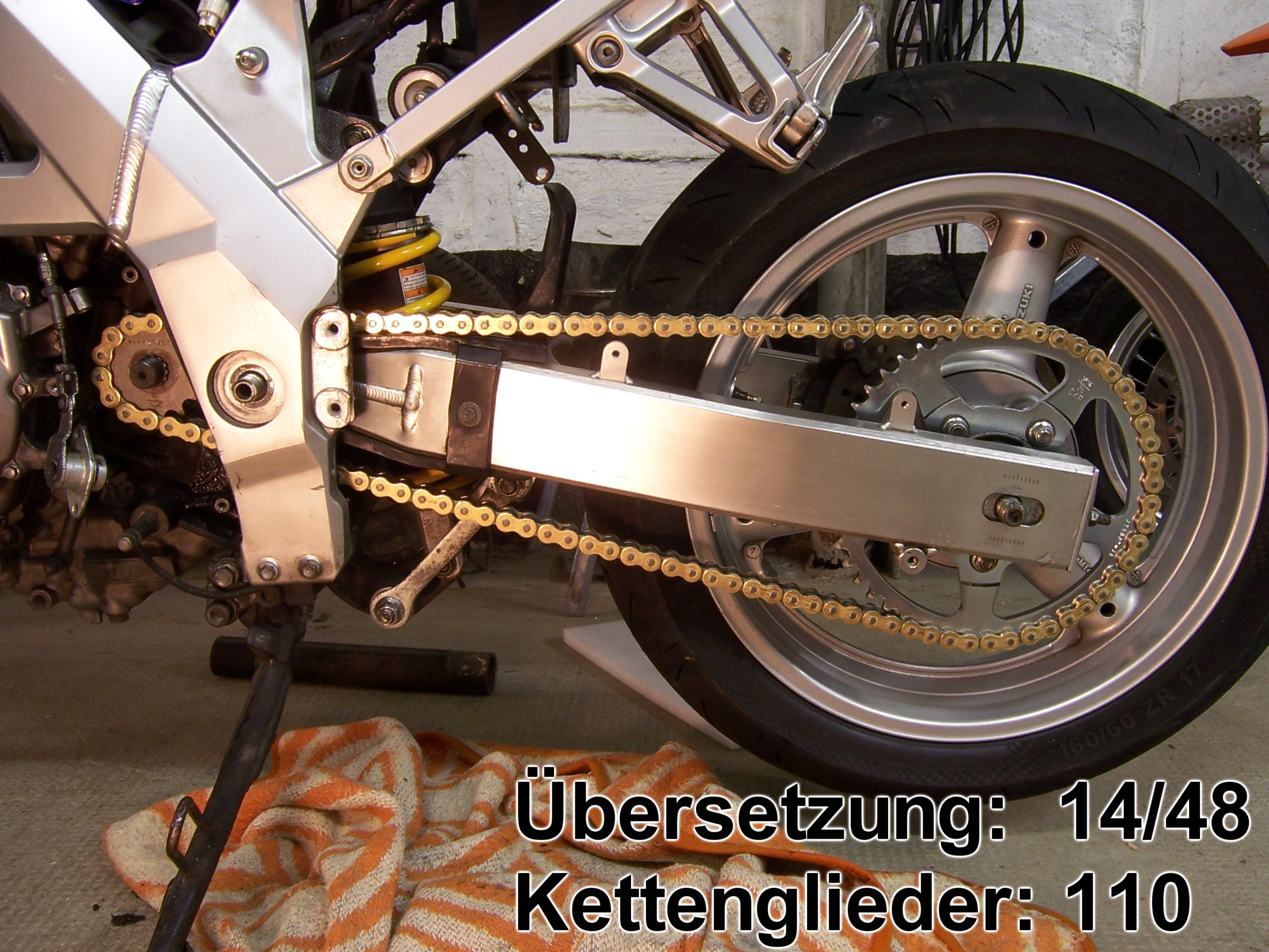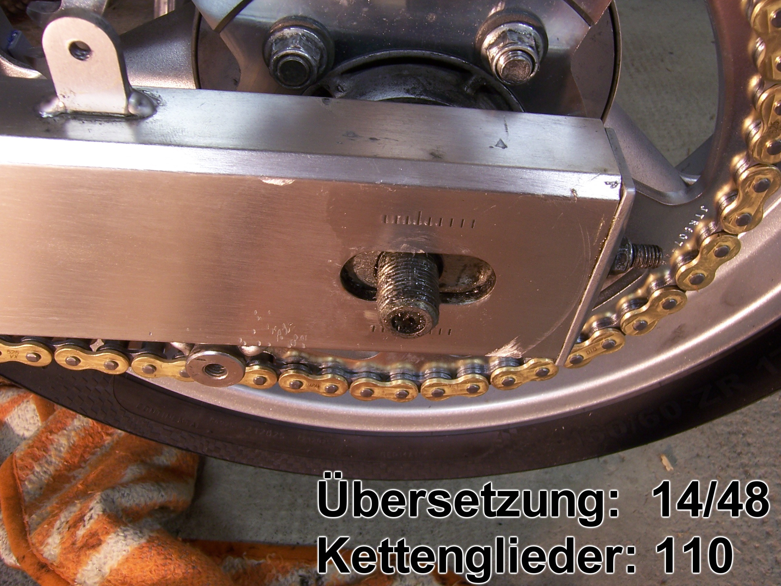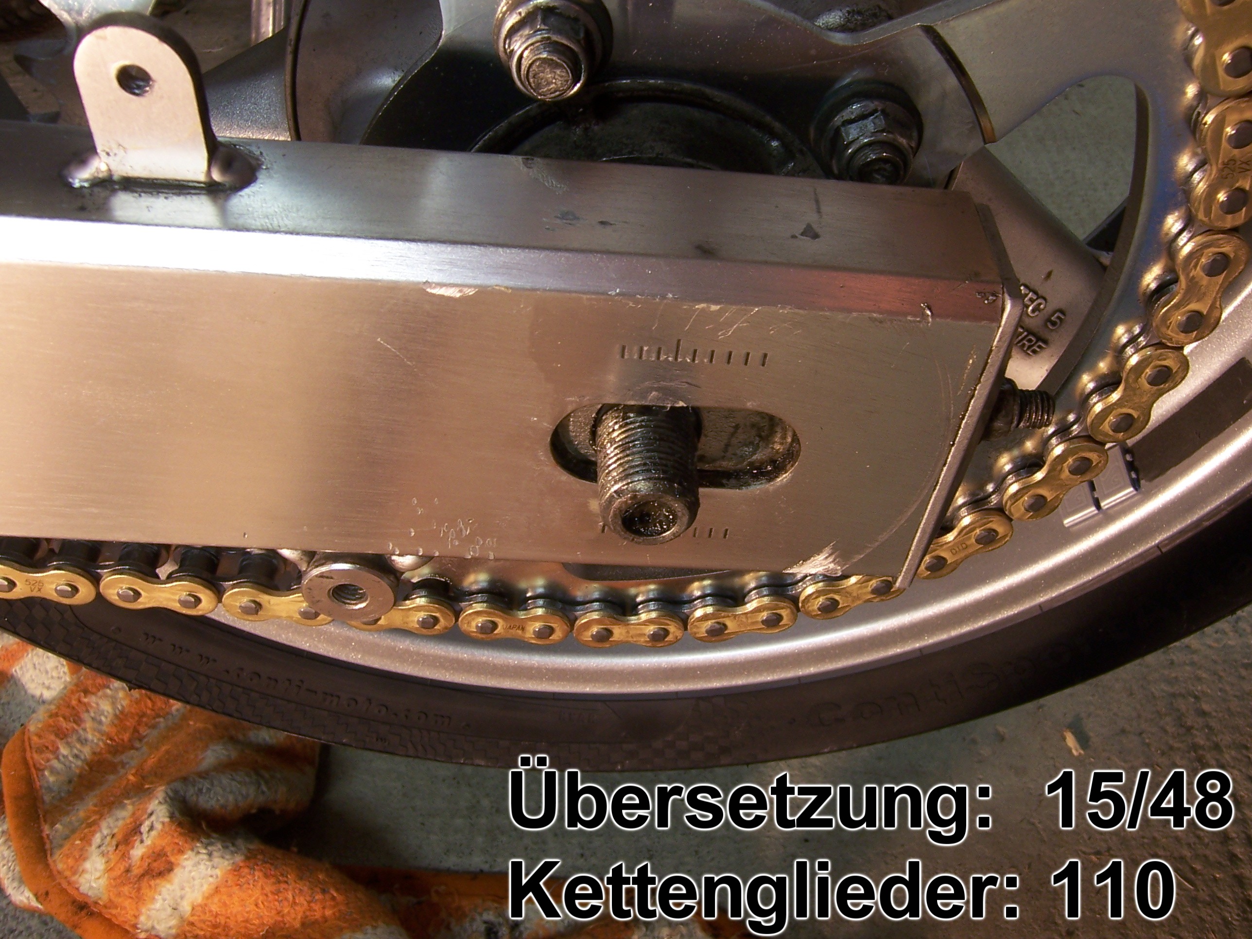 Das Langloch an der Schwinge ist ca. 45mm lang und mit der Achse (20mm) ist ein maximaler Versatz von 25mm möglich. Ich hab mir eine Lehre zum Messen des Abstandes Ritzelwelle und Hinterradachse gebaut und bin auf 600mm +- 5mm gekommen (Toleranz durch Messunsicherheit). Wer genauere Werte hat, oder gar für die N, bitte posten!