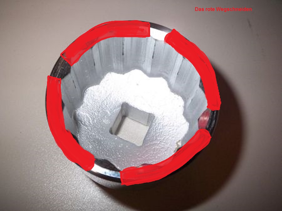 Du nimmst eine passende Nuss und Flex bzw. Dremelst alles soweit weg bis dass du nur die 4 Nasen noch stehen hast. Das habe ich bei meiner genauso gemacht und es hat super funktioniert.
