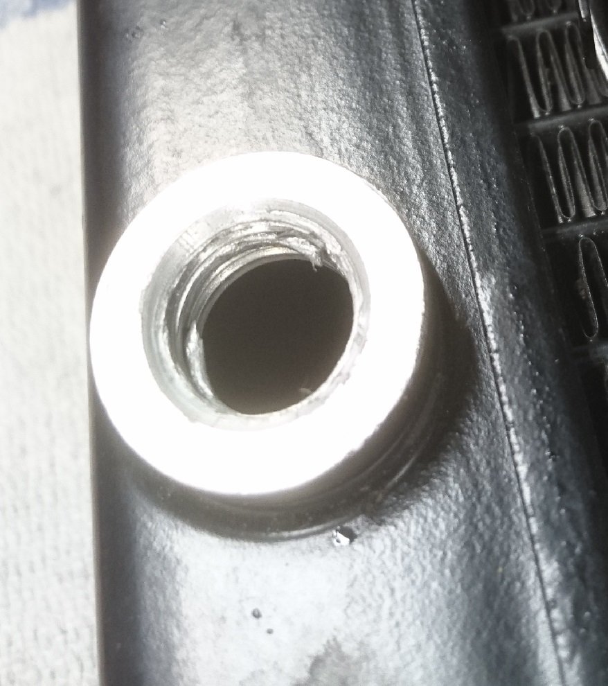 Der neue Temperaturschalter kam nach ein paar Tagen aus der Bucht, nur der alte Temperaturschalter wollte sich nach vielen Jahren in der SV nicht trennen und sah nach dem herausschrauben so aus... und das Gewinde im Kühler so ... Dank der Suchfunktion habe recht schnell die Gewindegröße gefunden, und dank eines gut sortierten Werkzeuglagers auf Arbeit, war das Gewinde im Kühler auch schnell nachgearbeitet und sieht jetzt wieder so aus. Im Laufe der Woche baue ich den Kühlerlüfterschalter und den Kühler wieder ein, befülle das System und gucke, ob alles Dicht ist.