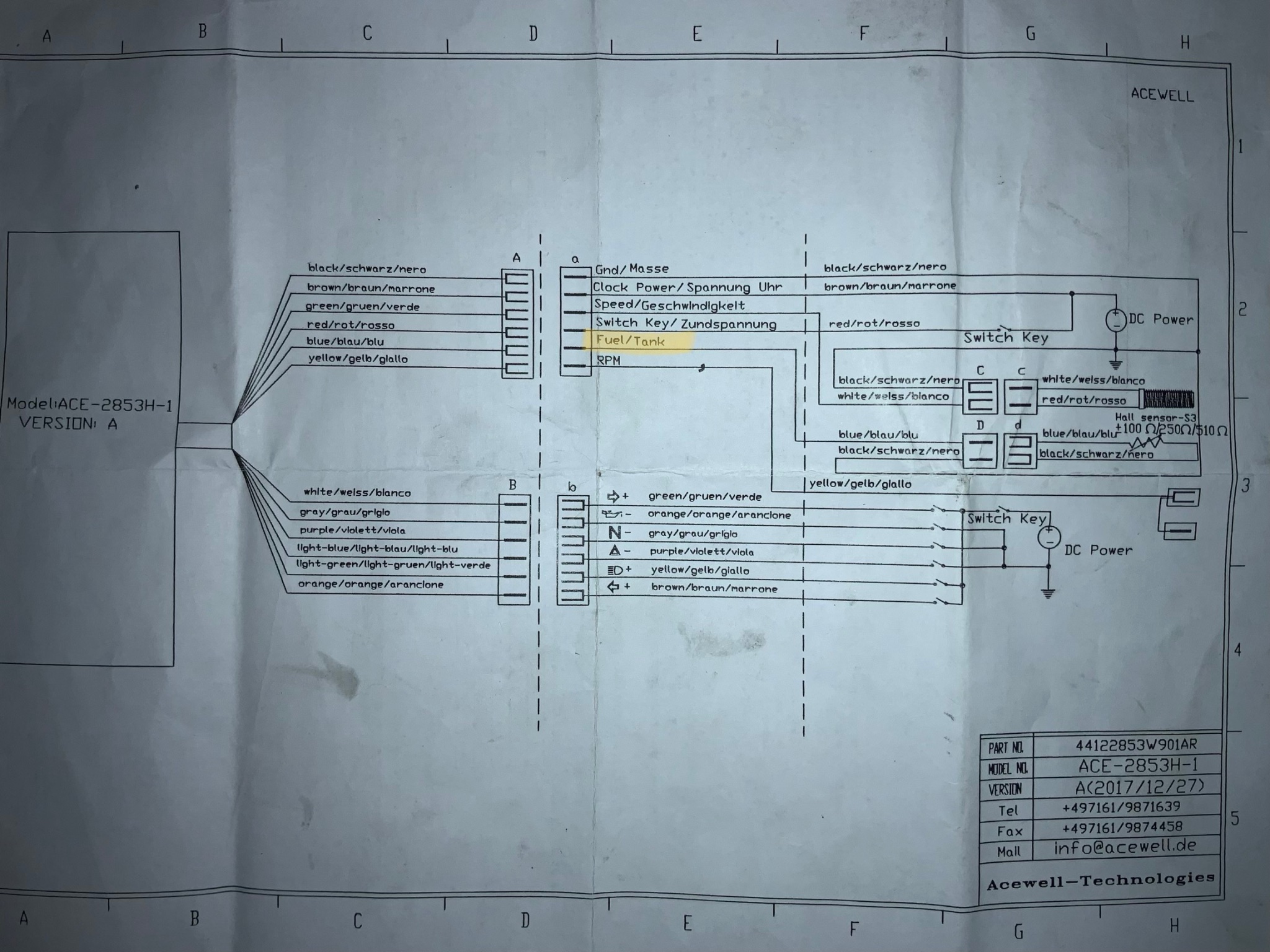 Am Kabelbaum vom Acewell Tacho ist am Tank-Sensor-Kabel nach einem Stecker wies scheint ein Wiederstand eingesetzt welcher wohl dafür sorgt dass die Anzeige 3/4 voll anzeigt. Wenn ich den Stecker mit dem widerstand dran abnehme fällt die Anzeige auf null balken runter. Also vom Acewell gehen 2 Kabel weg die wohl einmal Signal und einmal Masse sind??