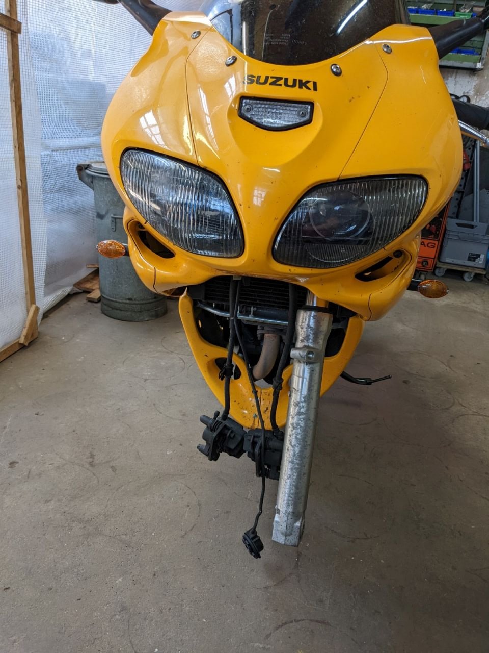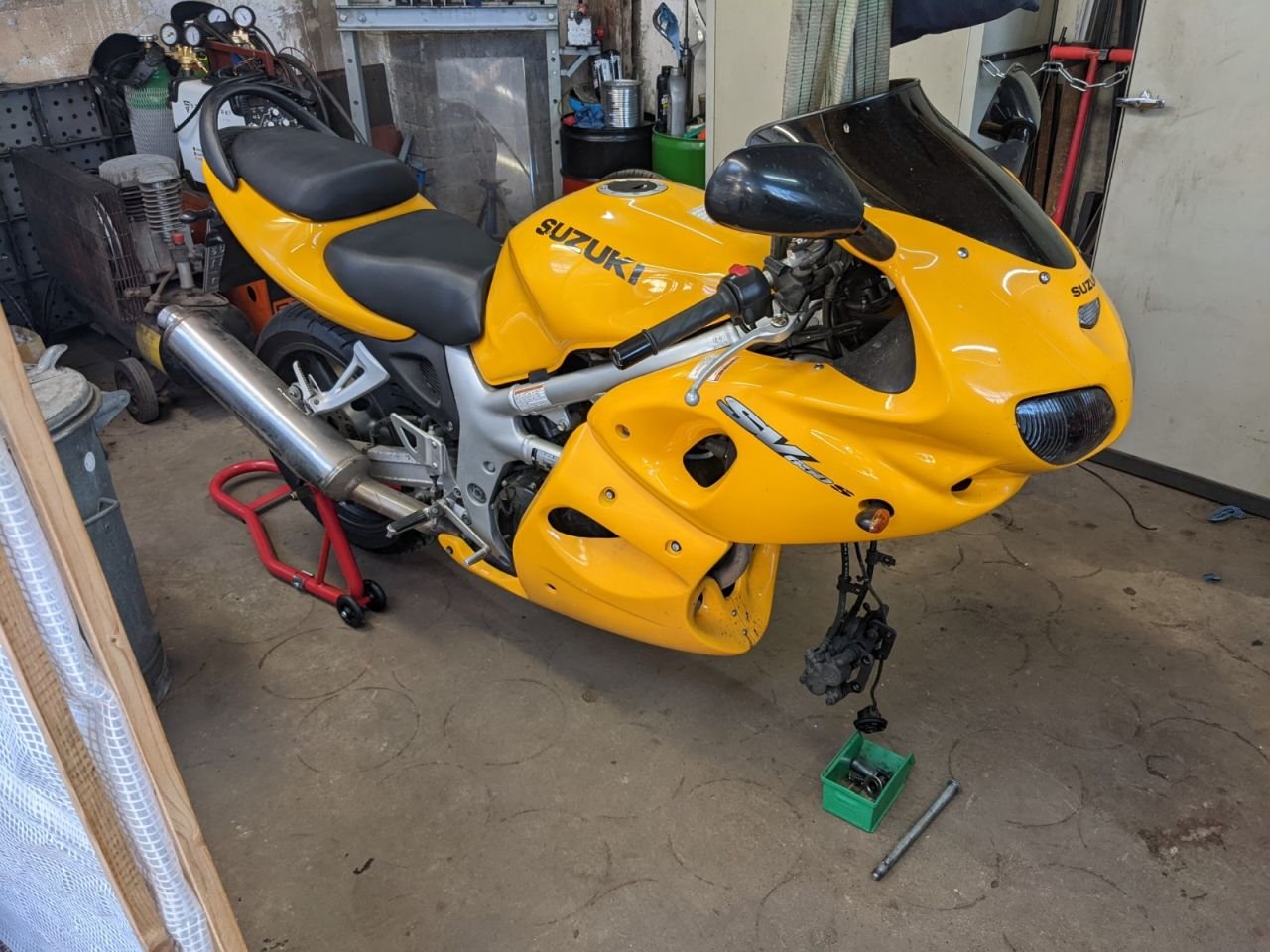 Ich hatte mir ja schon zur Lagerung im Winter so 0815-Billo-Montageständer gekauft, der hintere kam wieder zum Einsatz. Da ich mich normalerweise mit schweren Teilen außer Motorrädern beschäftige, verfügt die Werkstatt praktischerweise über einen Deckenkran mit Kettenzug. Also einen Schlupf vorne um die Gabelschwinge gelegt und ab in die Höhe.