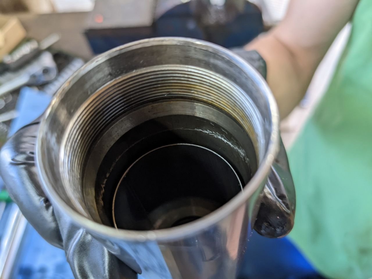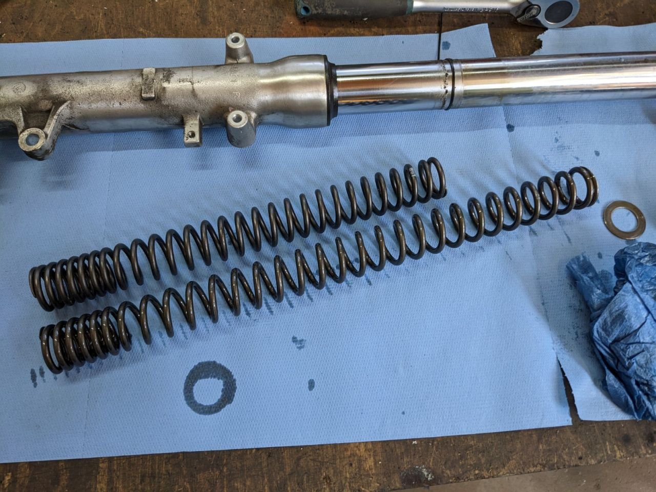 Die Dämpferbeine selbst waren dann in zügig ausgebaut, vier Schrauben pro Seite plus der normale Aufwand zum Ausbau der Vorderrads. Im WHB stand glücklicherweise der Tipp, die Verschlussdeckel schon vorher zu öffnen – sowas geht im Eifer des Gefechtes ja gerne unter. Minuten später lagen die Dämpfer dann auf der Werkbank und ich habe mich von oben ans Öffnen gemacht. Staubkappe, SiRi und WeDi gingen super raus, dann alles sauber gemacht und wieder in der richtigen Reihenfolge zusammengepuzzelt. Wellendichtringe baue ich regelmäßig ein und aus, normalerweise ist es aber mit viel mehr Ärger und Aufwand verbunden, also mit einem einzelnen Dämpferbein auf der Werkbank – deren Erneuerung war echt ein Spaziergang. Das Öl habe ich nach Empfehlung auf 15er gewechselt, brav entlüftet und alles wieder retour – keine zwei Stunden hat es gedauert, keine blutigen Arme, keine gequetschten Finger – als Auto- und Landmaschinenschrauber eine ganz neue Erfahrung
