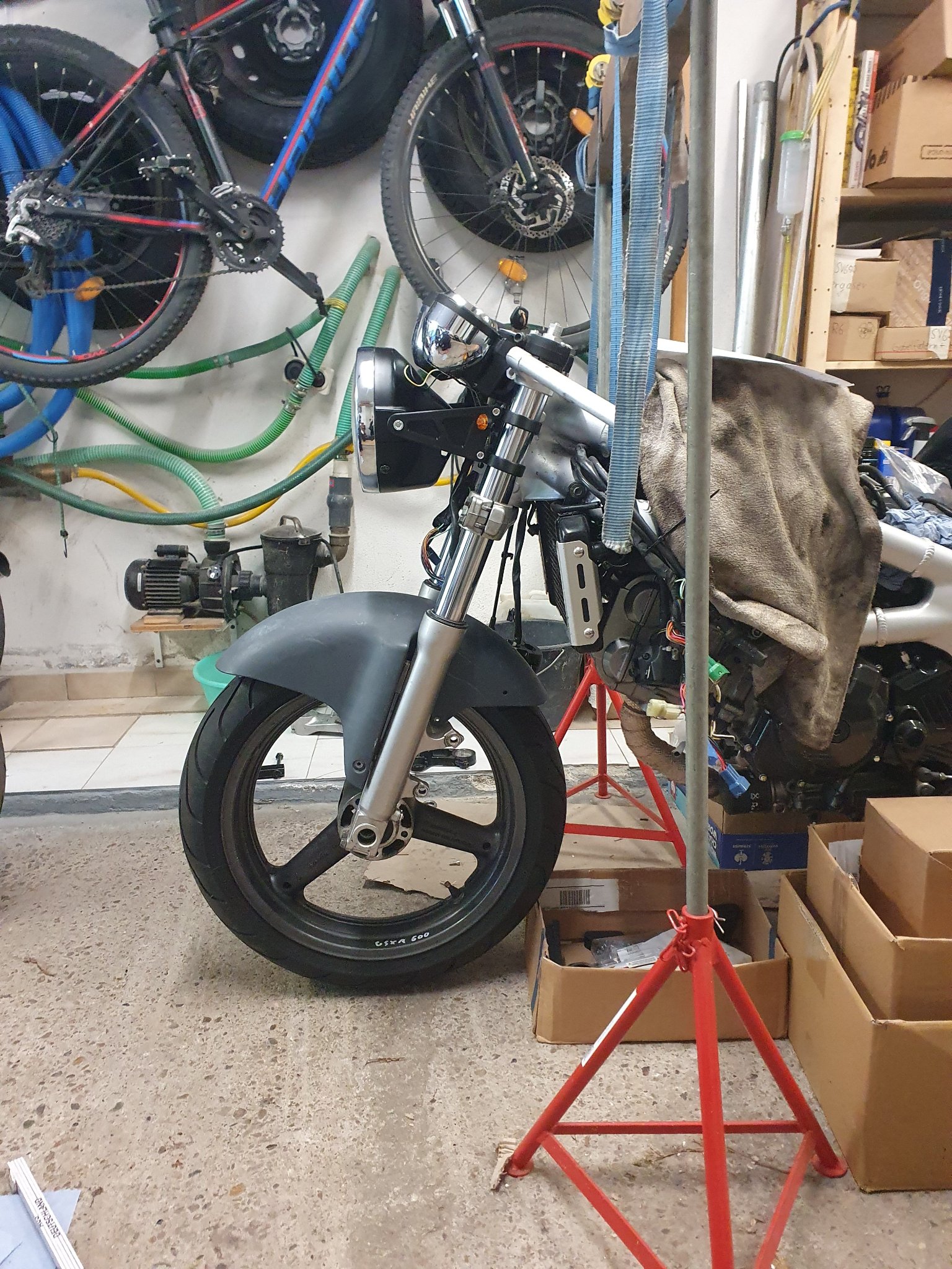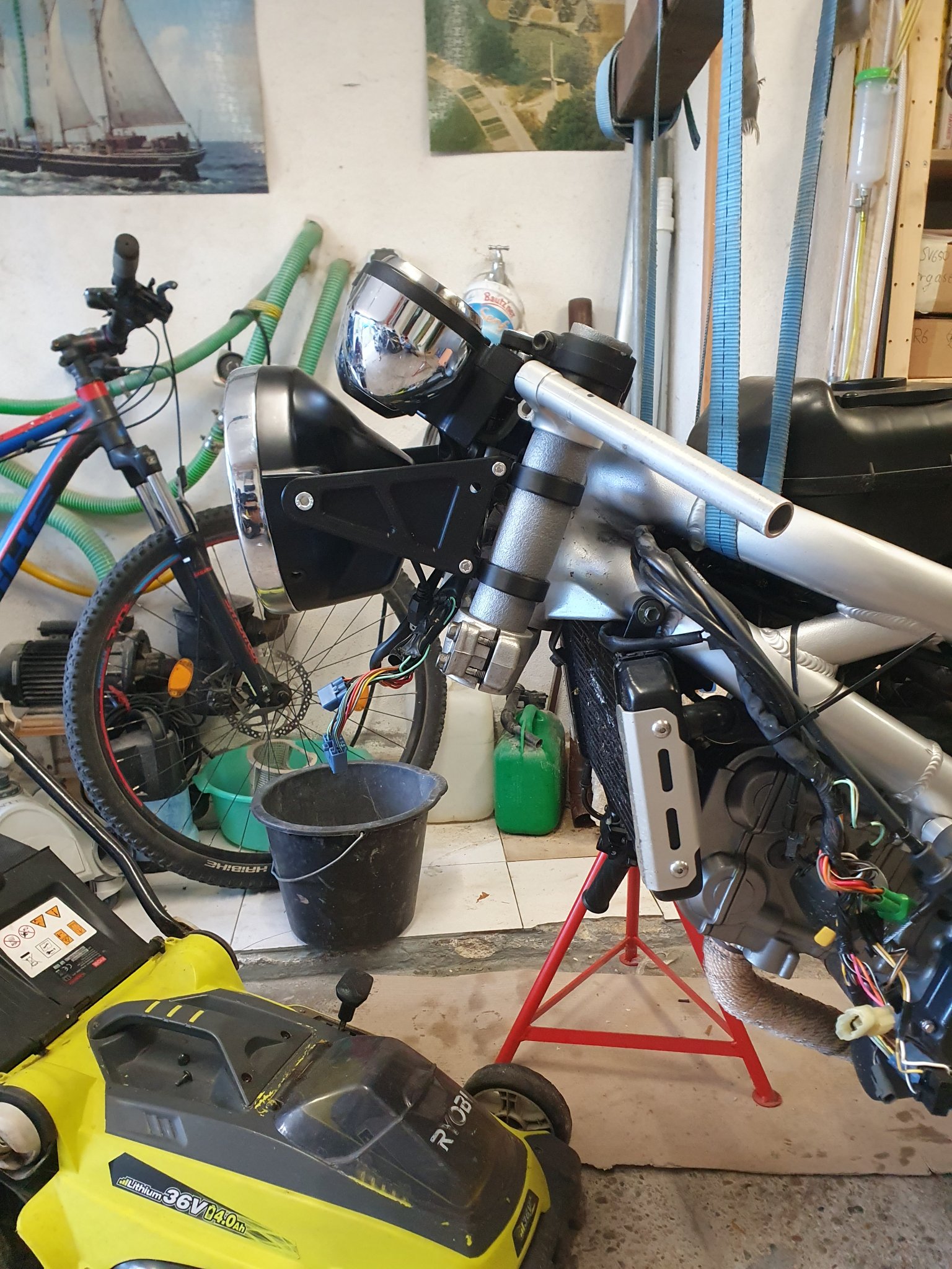 Natürlich habe ich dann auch mal meine Halterungen mit Gabel an die SV gebaut. Da die LKL noch nicht verbaut sind, habe ich ausm 3D-Drucker Platzhalter gedruckt. Macht das montieren/messen sehr viel einfacher. Dann gabs nochmal ne Revision für den Tachohalter in die finale Position. Die Schellen wurden umgearbeitet um Schrauben zu sparen und das Ganze zugänglicher zu machen, sowie die seitlichen Halter wurden etwas angepasst, allerdings gabs danach nochmal ne Revision, die noch nicht durch den Druck ist, basierend auf dem jetzigen Stand.