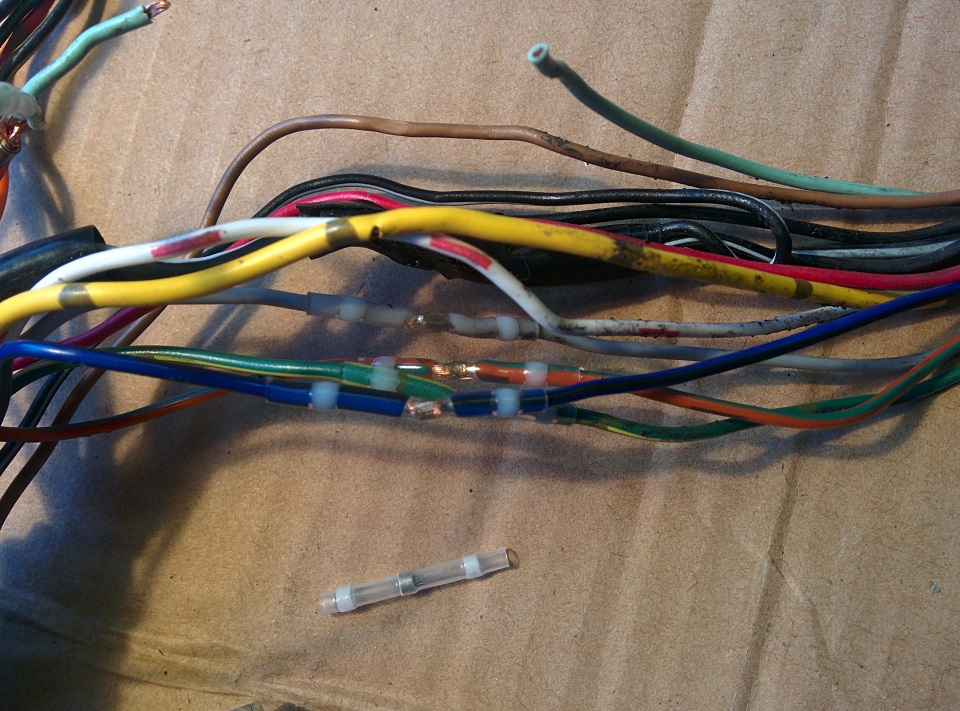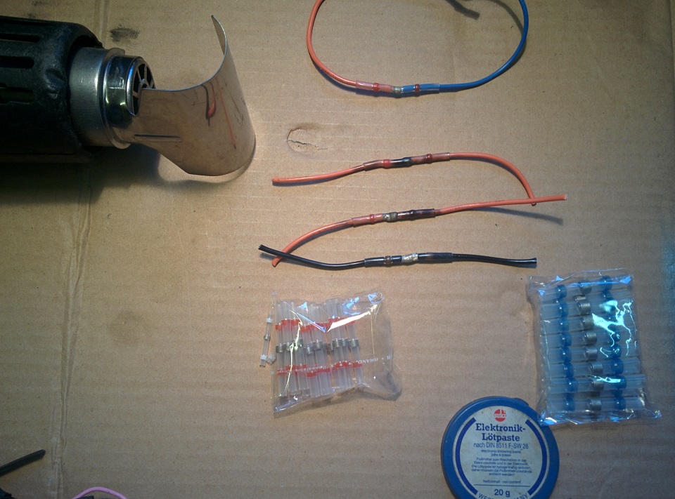 Ich habe die Lötverbinder bekommen. Zunächst habe ich mal ausprobiert, wie das funktioniert. Dazu habe ich mir einige Kabelreste genommen und die einfach mal versucht zusannen zu fügen. Mit dem Feuerzeug geht das, aber da muss man sehr aufpasssen, damit die Isolierung und auch die Finger nicht verbrennen. Es funktioniert auf jeden Fall mit dem Feuerzeug und ist eine m.E. gute Lösung für unterwegs. Dann habe ich es mit dem Heizlüftföhn versucht und da ging ganz gut. Man braucht aber Platz im Kabelbaum, um den "Hitzeumlenker" gebrauchen zu können. Bei meinen Arbeiten war das der Fall, so habe ich das mit dem Heisföhn gemacht.