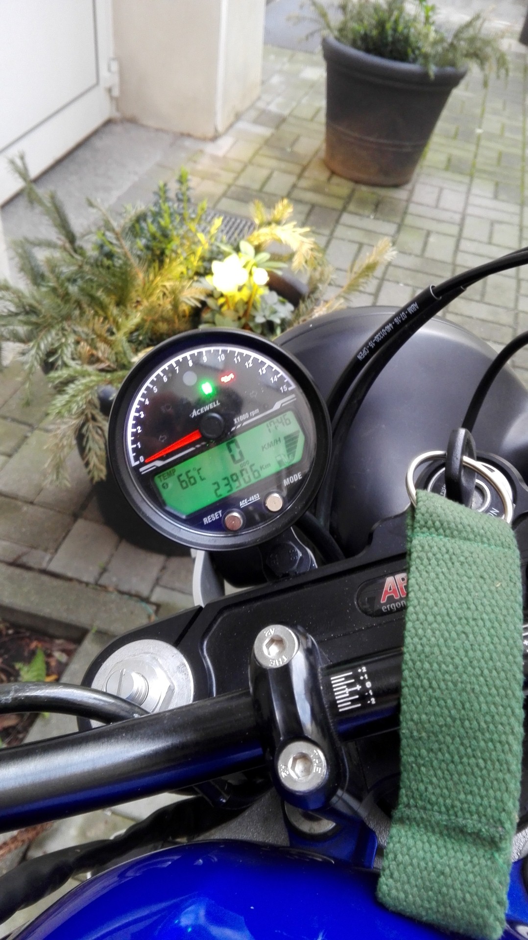 Geschwindigkeitssensor ist vorläufig der von Acewell mitgelieferte am Hinterrad, per GPS getestet. Stimmt genau. Bei dem Originalen hat die Anzeige schön rumgesponnen- im Leerlauf tanzten Geschwindigkeitsangaben bis 375 km/h auf und ab 8O