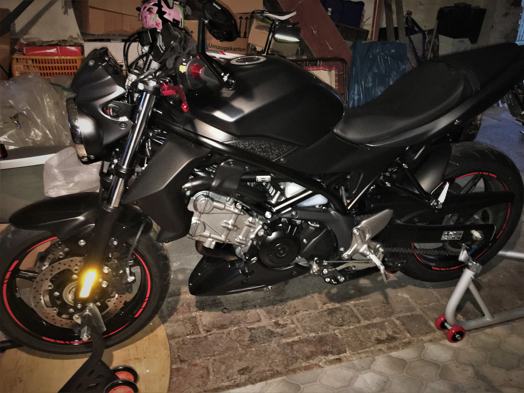 Die von Bodystyle hätte vielleicht besser zum Motorrad gepasst, weil sie die Formen und Kanten des Fenders vorn gut weiterführt, aber für eine Hinterradabdeckung an meiner schwarzen SV hat die von Puig durchaus gereicht. Und Bodystyle wäre auch deutlich teurer gekommen.