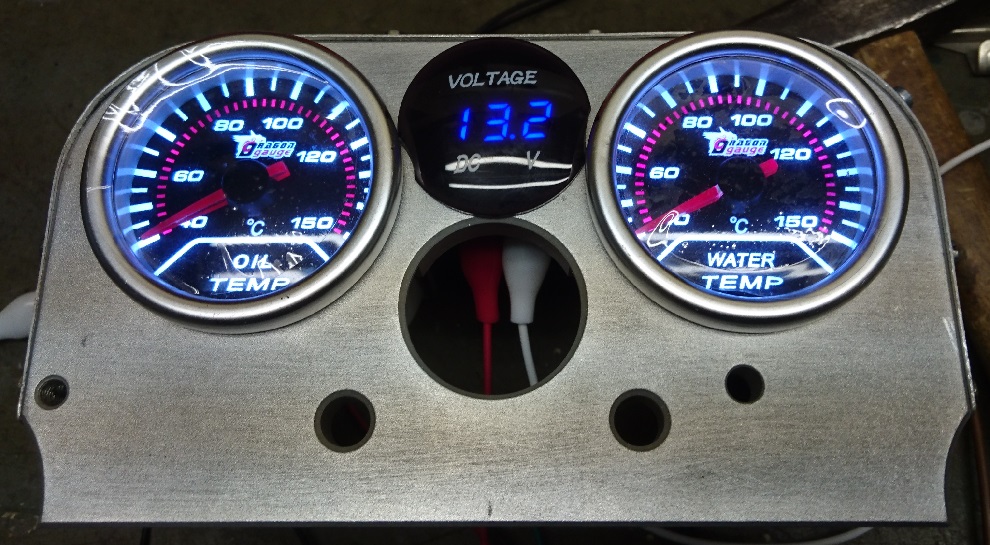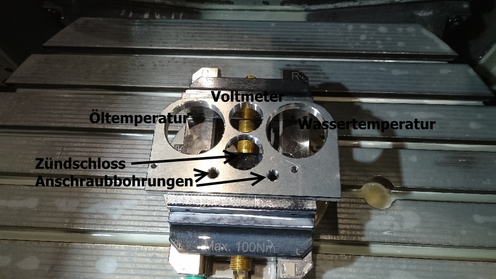 Den Instrumentenhalter habe ich auf einer CNC-Fräsmaschine auf Arbeit (natürlich außerhalb meiner Arbeitszeit) fräsen dürfen. Hier sind Öltemperatur, Voltmeter, Wassertemperatur vorgesehen.