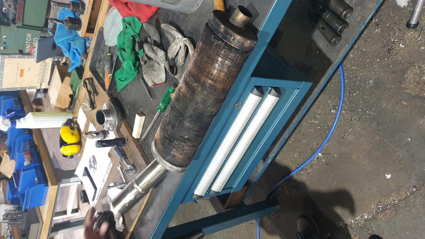 Ich habe erst den hinteren Deckel abgemacht, aber das ist nur ein Deckel mit dem äusseren Rohr. Der eigentliche Schalldämpfer ist ein komplettes verschweisstes Teil. Man macht dann den vorderen Teil auf und kann den ganzen Schalldämpfer aus der Aluhülle herausziehen.