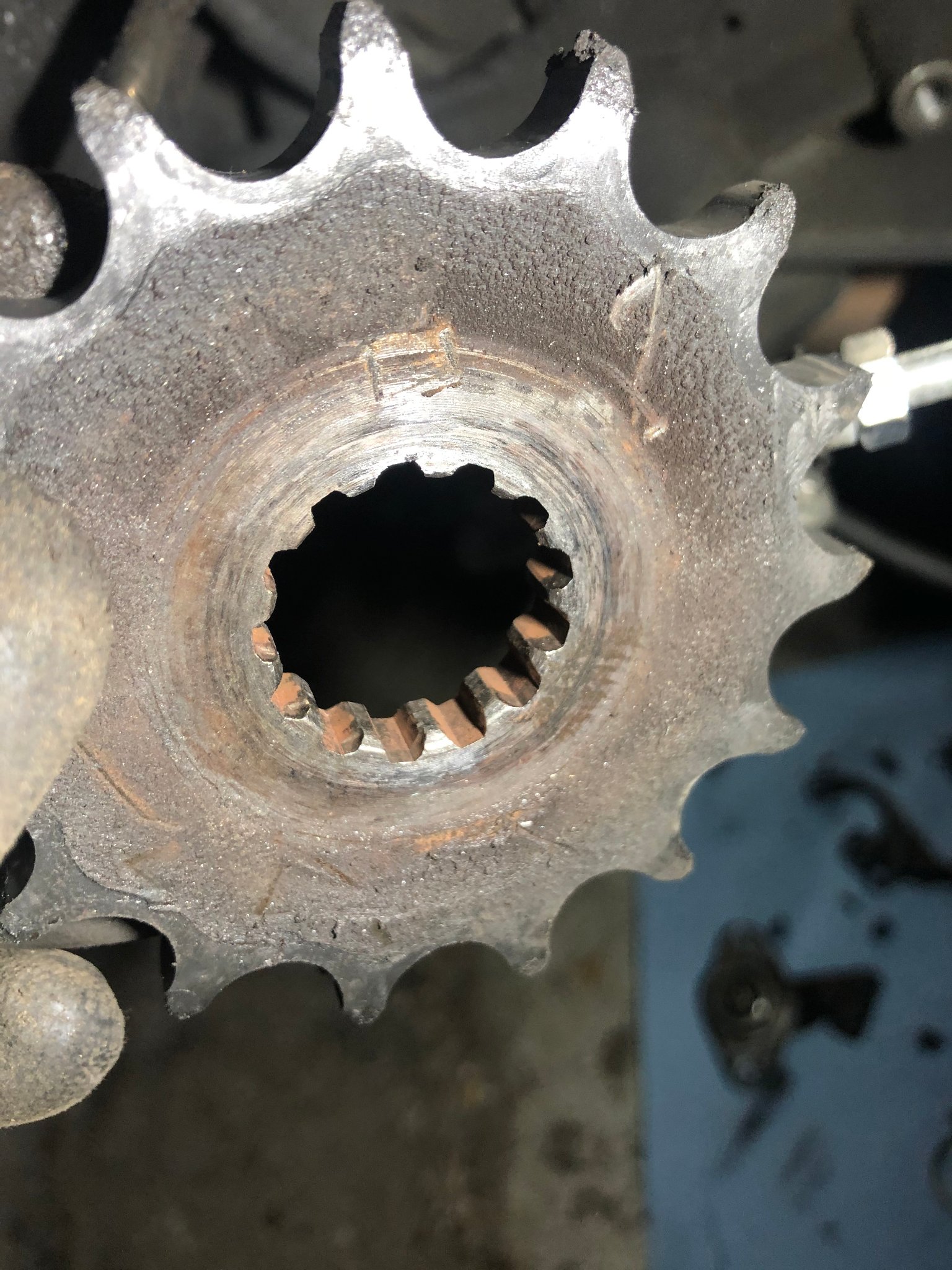 ich bin Montag mit meiner SV650 Bj.2008 aus dem Urlaub zurückgekommen (ca.1000km Autobahn), dann 500m vor meiner Wohnung drehte plötzlich der Motor hoch, als wäre ich in einem Zwischengang. Ich hatte also keine Kraftübertragung mehr und die Vermutung, dass Getriebe oder Ritzel kaputt sind. Der Verdacht erhärtete sich, da die Getriebewelle mitdrehte, obwohl das Ritzel blockiert war. Nach langer Quälerei und mit einem Schlagschrauber habe ich dann die Mutter gelöst bekommen, den Schaden sieht man denke ich gut auf den Bildern.