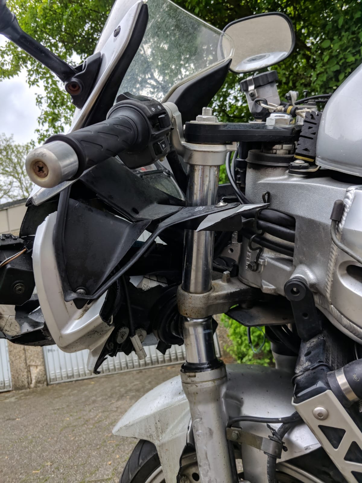 Kaputt sind: Gabel, Verkleidung vorne, Lichter, Kühler, Schutzblech, Kotflügel, Bremshebel, Bremsflüssigkeitsbehälterbefestigung. Felge vorne ist ein wenig lädiert, aber wahrscheinlich noch nutzbar. Vielleicht sind auch die Standrohre noch nicht vollkommen zerstört. Sicher würde im Laufe einer eventuellen Reparatur noch mehr zukommen, als ich soweit sehen kann, daher meine Frage: