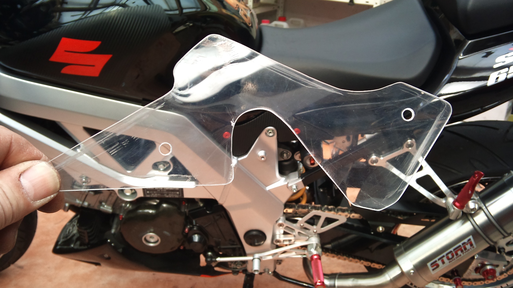 Die Gummistopfen am Tank und an der Heckseitenverkleidung bleiben. Am Tank ist wegen Platzmangels keine Verschraubung möglich, weswegen man sich einen Propfen angertigen muß. Wegen der Symmetrie habe ich auch vorne am Neuteil eine Schraube durchgesteckt, einen Kunststoffring aufgesteckt und mit einer glatten Innensechskantschraube einer V-Bremse, befestigt. Die Schraube paßt wunderbar vom Durchmesser in den Gummistopfen.