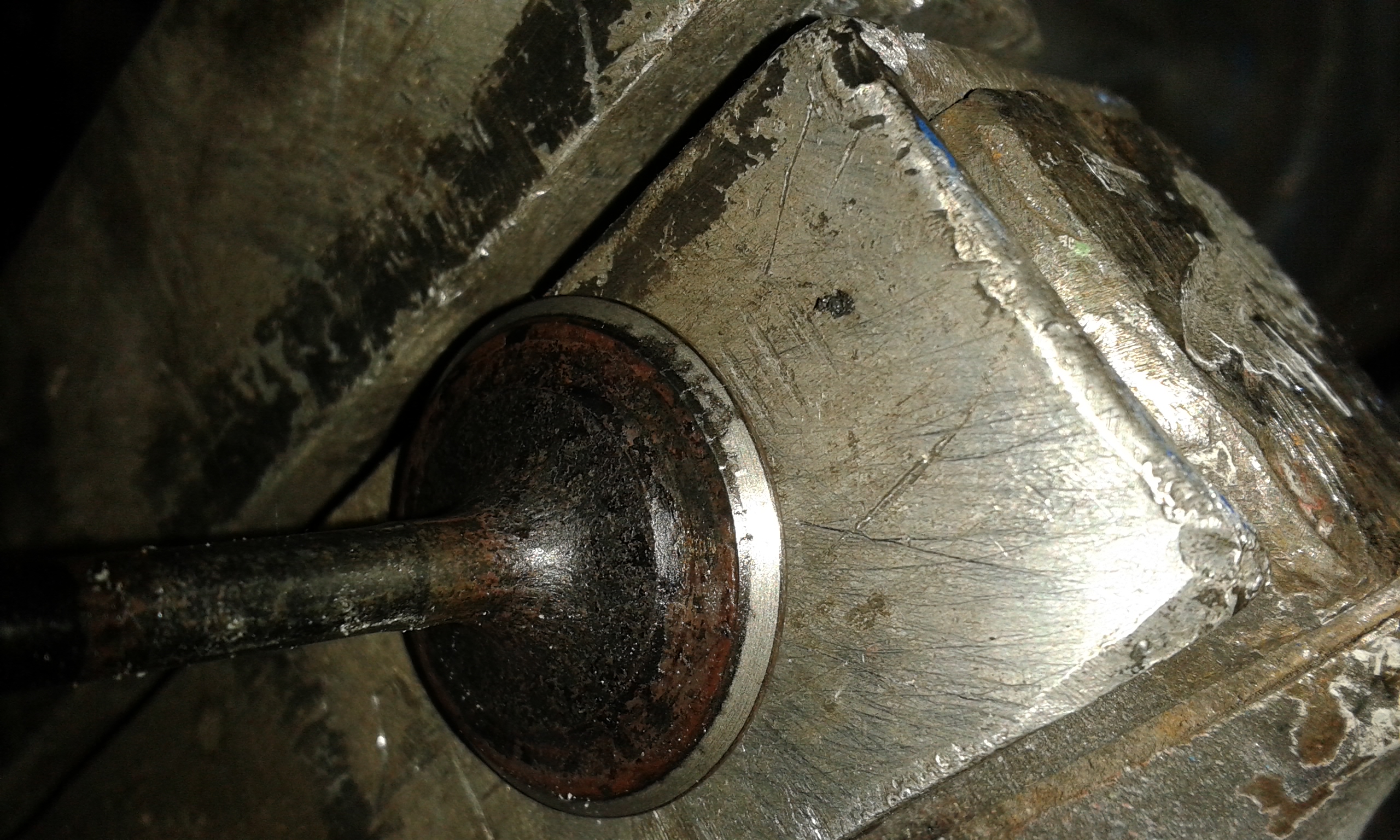 Risse am Teller eines Auslassventils am vorderen Zylinder (Bild auf 14.00Uhr, klick = groß). Habe noch guten wenig gelaufenen gebrauchten Ersatz da, die habe ich jetzt im originalen Zylinderkopf verbaut. Passten super, nach kurzen einschleifen perfektes Tragbild.