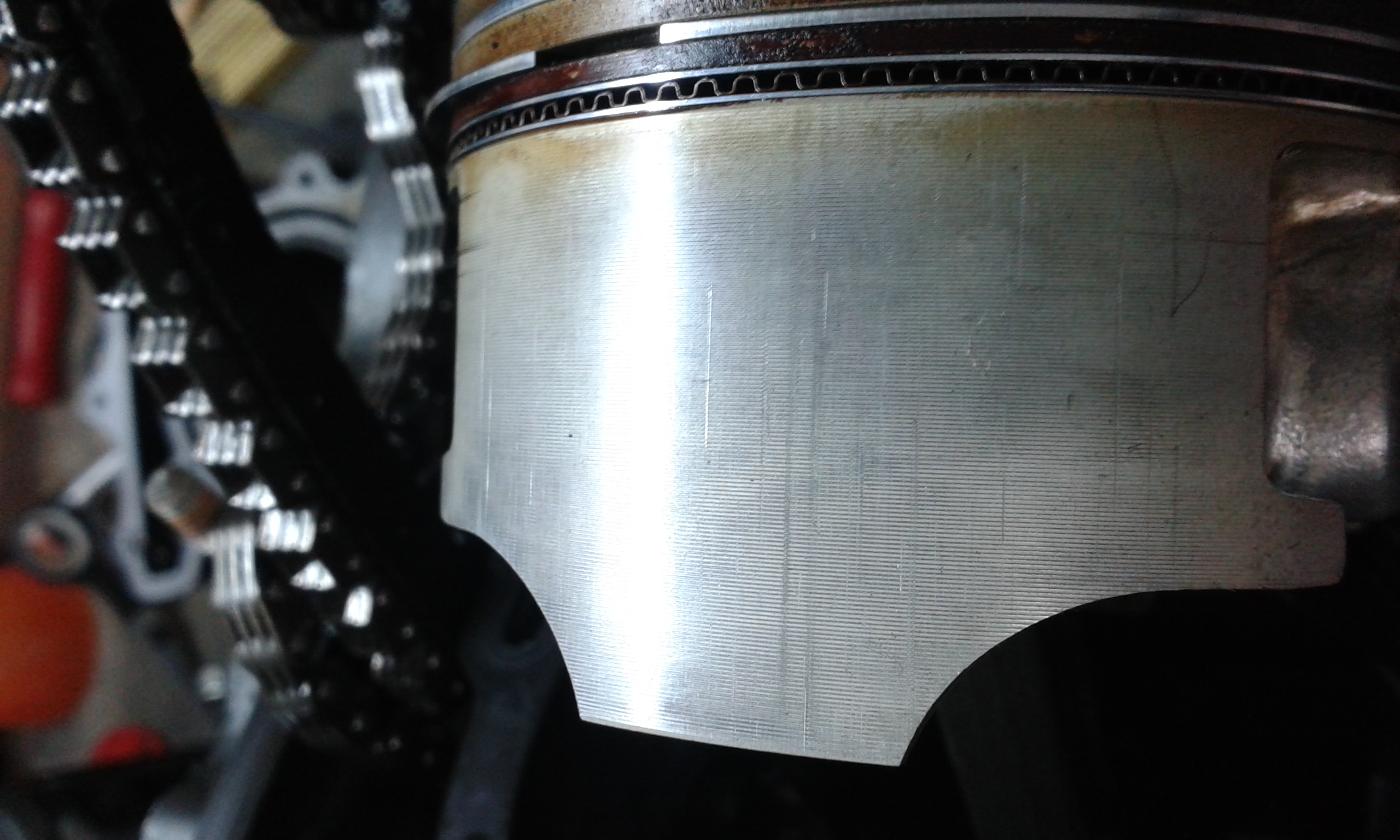 Das Laufspiel von Zylinder und Kolben ist noch im original Zustand (0,03mm), Kolben hat Drehrillen bis ans Hemd runter, alles prima. Die Zylinder werde ich wieder kurz durch hohnen, das ist wichtig weil die rauheit das Öl "hält". Die kolbenringe sehen gut aus, werden aber nochmal auf Verschleiß geprüft...