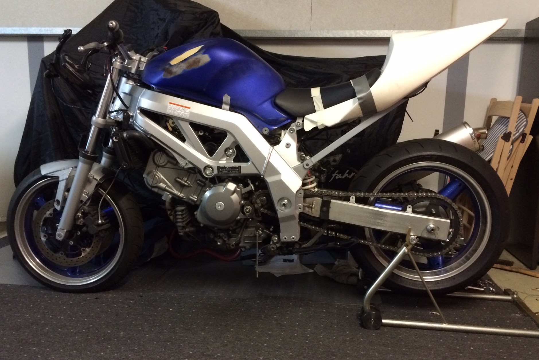 Habe letzte letzte Woche eine SV 650 Bj. 2003 ergattert. Was sie mal werden sollte weis ich nicht aber auf jedenfall war sie komplett zerlegt.