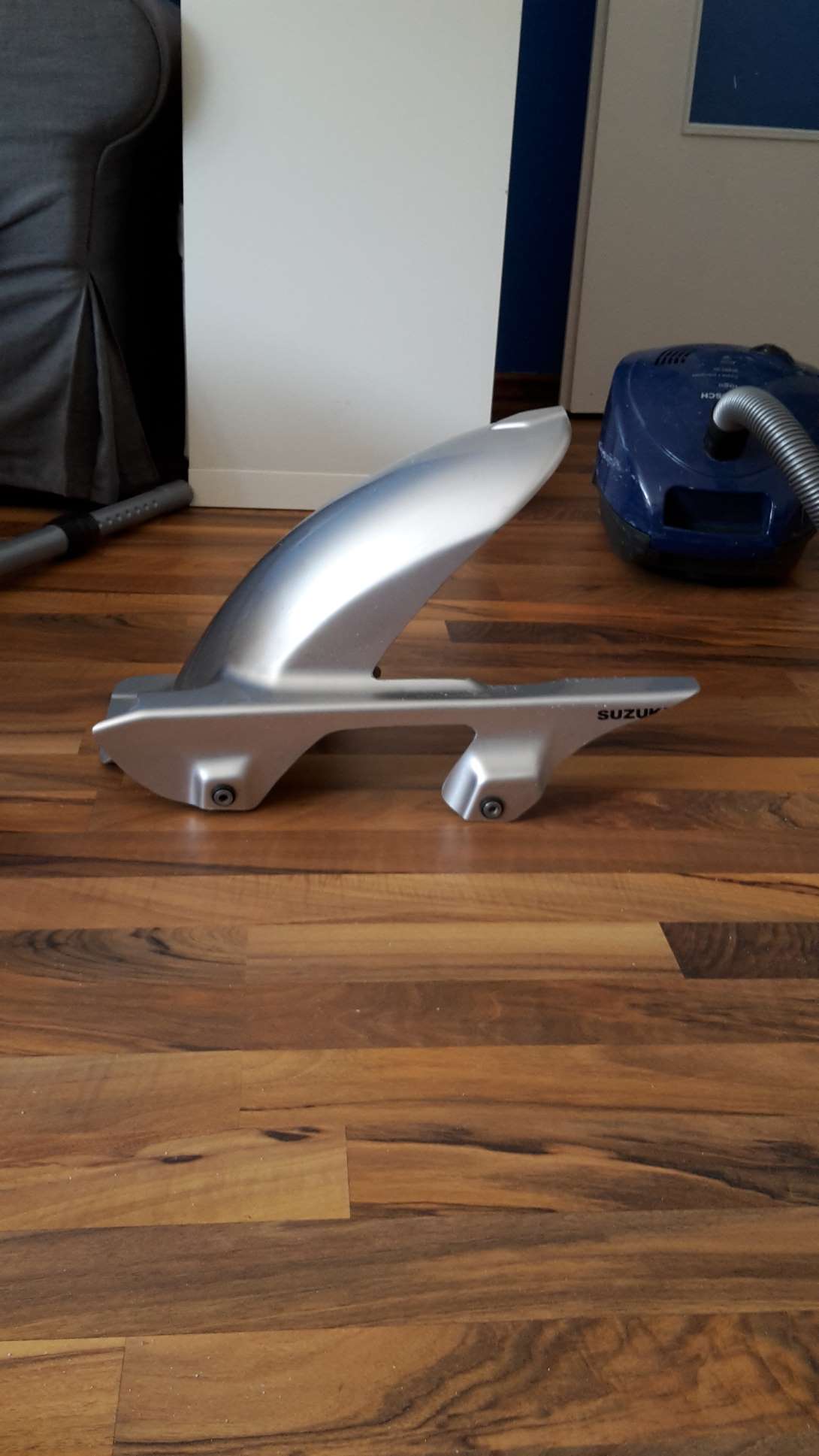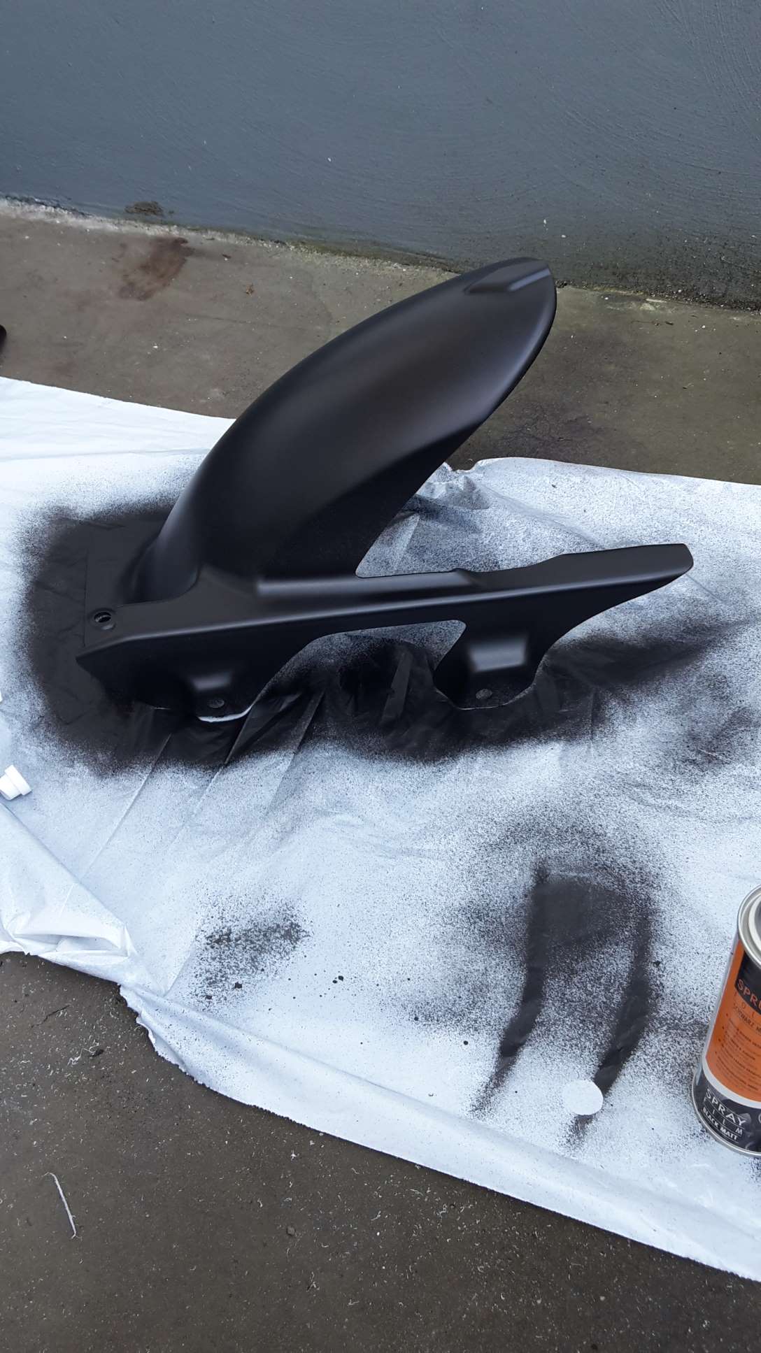 Wie angekündigt hab ich die Hinterradabdeckung lackiert. Verarbeitung war easy as. Teil fettfrei säubern und dann nacheinander etwa fünf dünne Schichten auftragen. Der mitgelieferte Fächersprühkopf war dafür super geeignet. Nach 30 Minuten kann das Teil schon wieder benutzt werden. Beim ersten mal hatte ich ne fette Nase drin, also 30 Minuten gewartet und alles wieder abgezogen. Das funktionierte auch 1a und rückstandslos. Der zweite Versuch ist dann absolut sauber geglückt. Hier das Ergebnis: