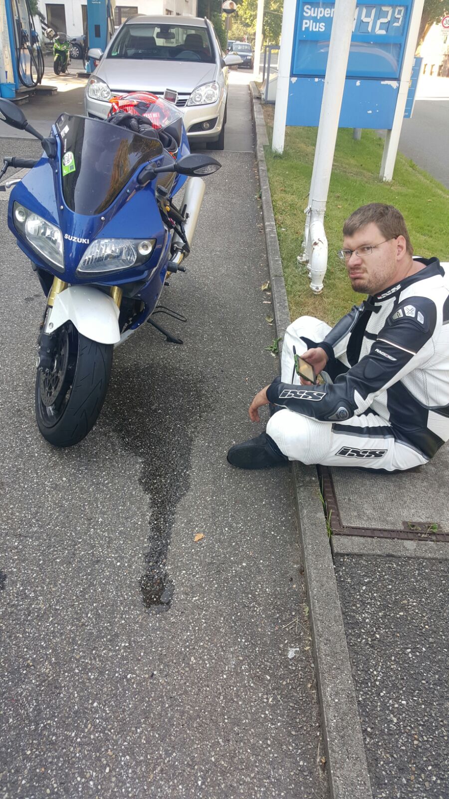 Schöner Scheiß. Heut auf der tour triefts dann einfach vom kühler. Erst gedacht, dass es wasser von der straße ist, aber war dann doch vom kühler. Aufgefüllt und heim. Hat einer son ding rumliegen? Da aufm bild hockt meiner einer und schmollt... Vielleicht doch ne 1000er rennfeile kaufen...