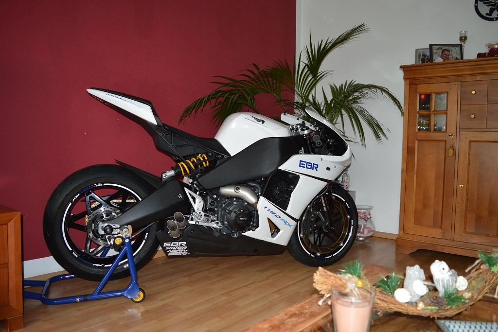 Für die Renne steht noch eine BMW S 1000 RR (furchtbar anstrengend) und mein Liebling, eine EBR 1190 RX im Stall.
