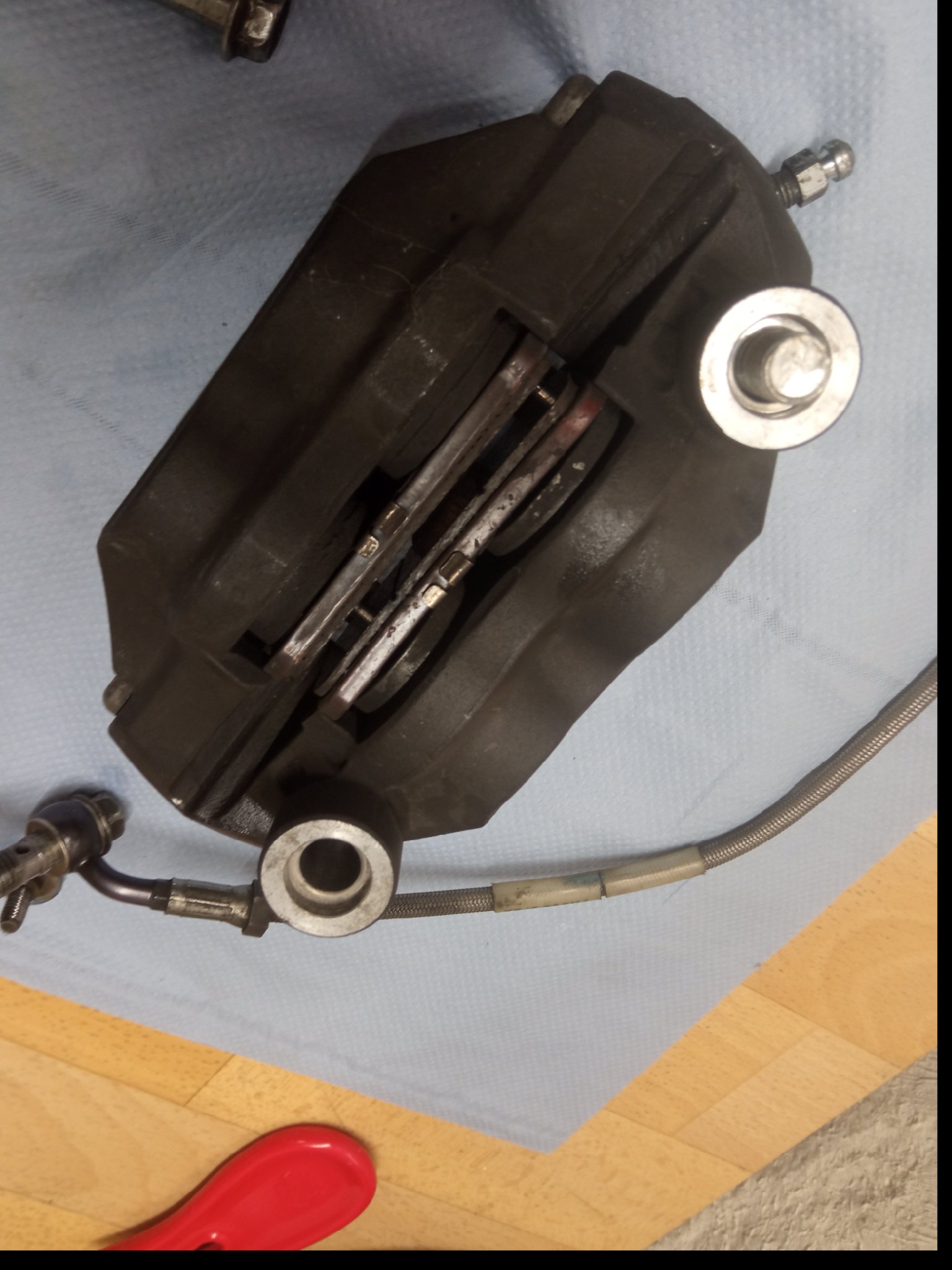 Es geht wieder an Schrauben. Bremse und Gabel sind dran. die Bremsbeläge Brembo Sinter haben diesmal keine 4000 km runter und sehen nicht mehr so toll aus. Außerdem will ich die Sättel grundreinigen.
