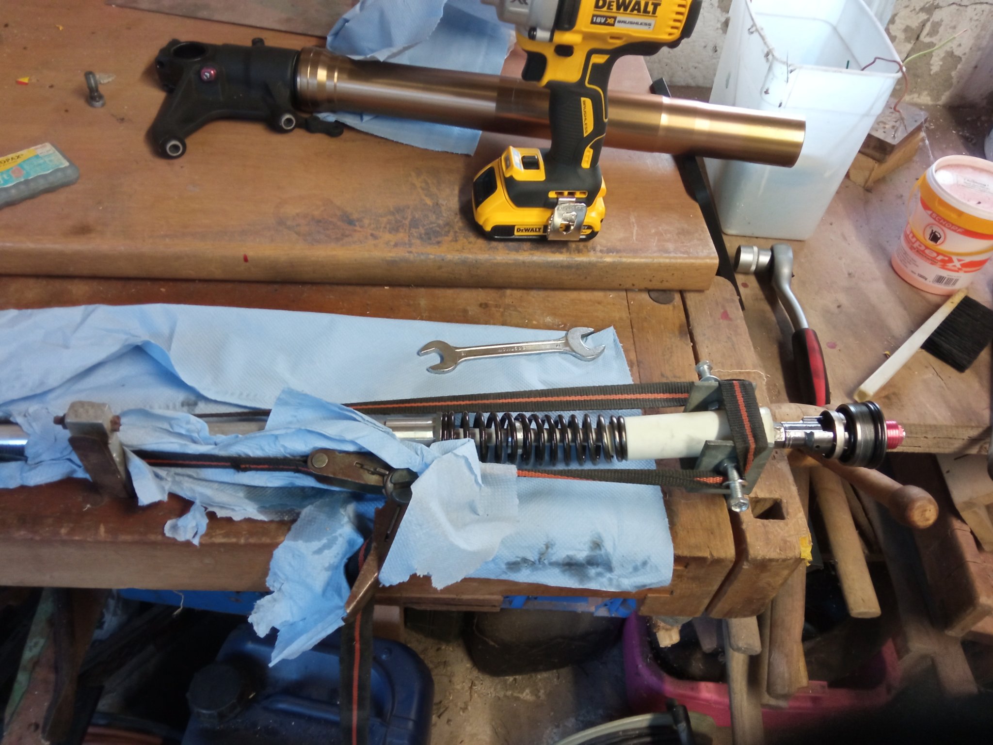 Dazu muss ich an die Kontermutter unter der Plastikabdeckung. Aber dazu muss die Feder zusammengestaucht werden. Also musste ich einen Federspanner basteln. Der besteht aus einem Halter für Zaunsriegel den ich in den Schraubstock einspannen kann. In diesen habe ich zwei 8er Löcher gebohrt und zwei Schrauben mit 4 Muttern angebracht. So kann ich die Plastikhülse einspannen. Die Cartridge ziehe ich nun mit dem Spanngurt zusammen. Und siehe da, die Position der Gabelstopfen war falsch, viel zu weit unten. Ich hatte vorher nur 6 Klicks zum verstellen. Das hat mich schon gewundert. Jetzt sind es 14 Klicks.