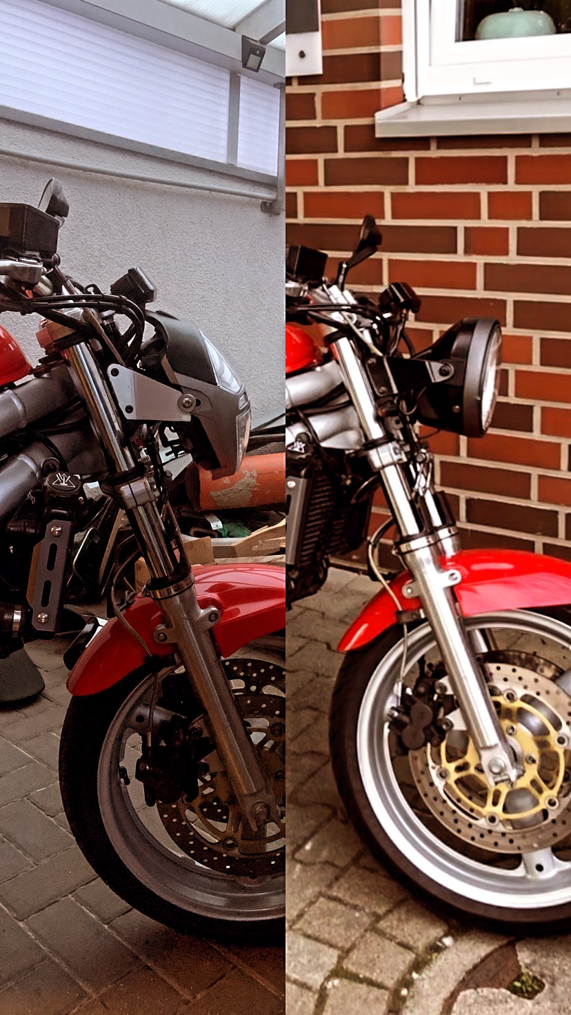 Ich wollte euch einfach mal mitteilen, dass ich passend zum Heckumbau, mich auch für die Front der 696 entschieden habe. Die Bilder zeigen ein erstes Testen des Fitments. Ich werde noch gescheite Halter bauen und die Regulierung des Neigungswinkels ähnlich dem Original überführen. Seitlich sollen nachher dank 3D Druck (wie meine Koso Tacho Abdeckung bereits) durch Kappen keine Schrauben zu sehen sein.