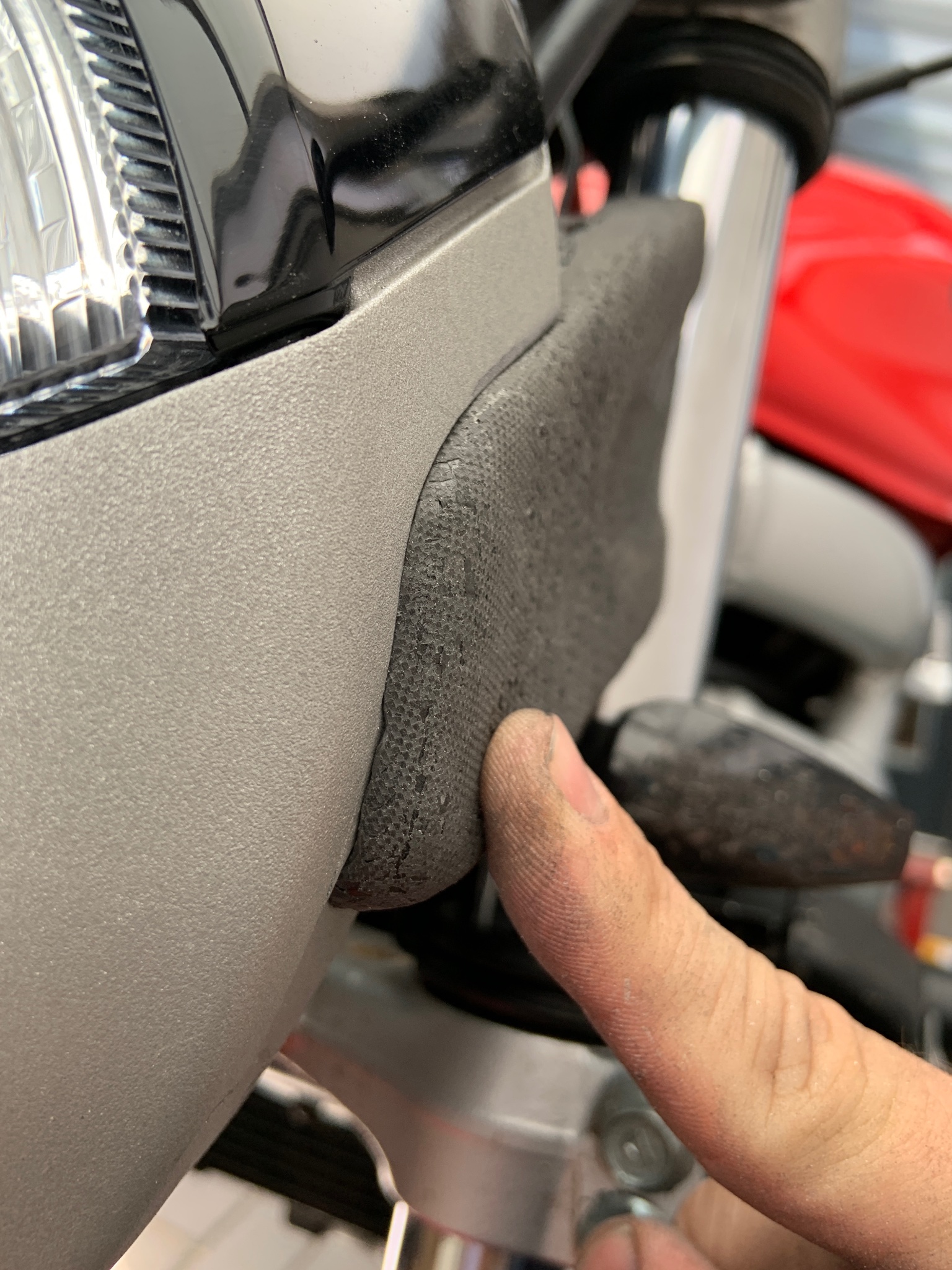 Der vertiefe Ducati Schriftzug ist jetzt aufgefüllt und die Abdeckung mit einem geplotteten Suzuki Schriftzug in schwarz glänzend einlackiert.
