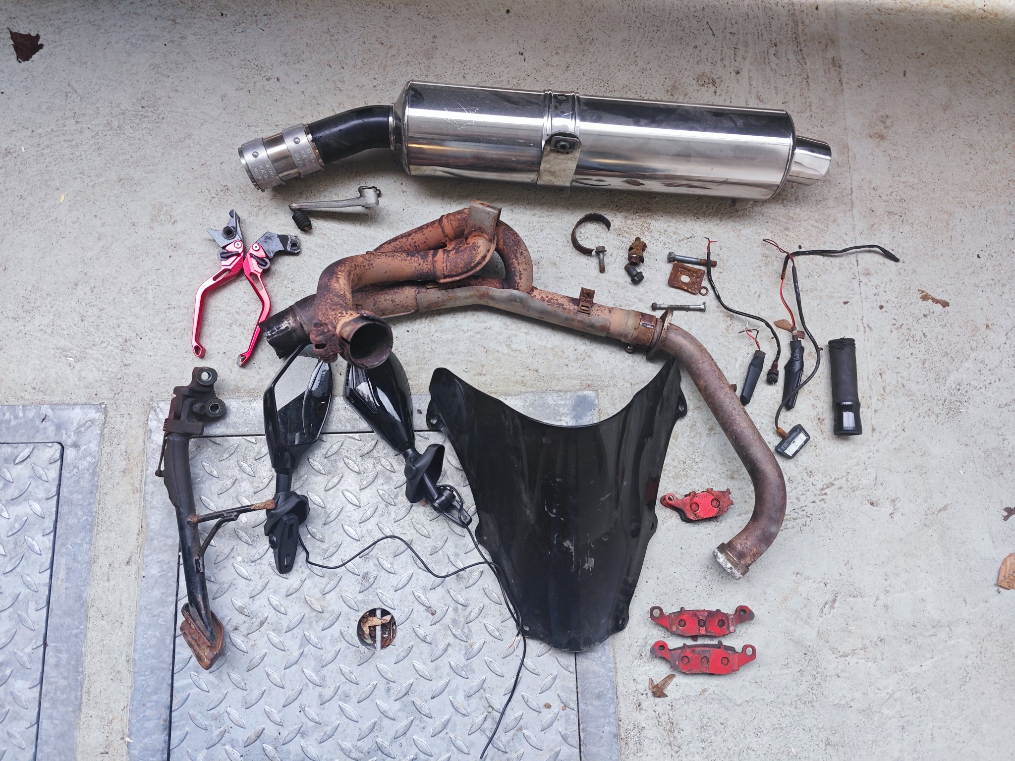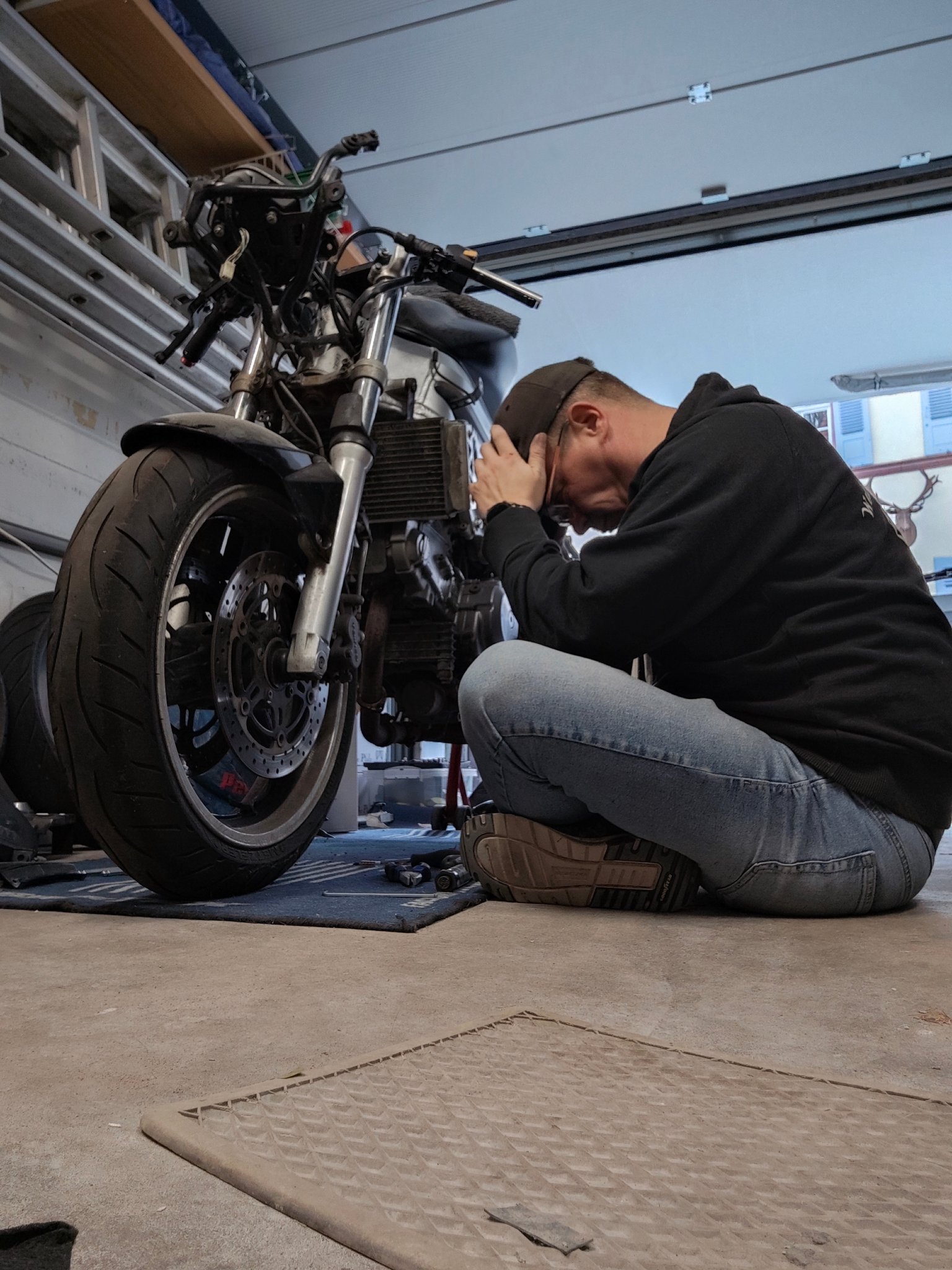 Ich glaube nicht. Habe bereits einen Austauschmotor hier stehen, der eingebaut werden soll. Wenn der drinnen ist, wird die Gabel überholt, ein gebrauchtes Gixxerbein besorgt, das ebenfalls revidiert wird. Dann noch die Räder wieder auffrischen und polieren, die Verkleidungsteile und den Tank abschleifen und neu lackieren lassen, Spiegel, Blinker, Scheibe und Auspuff kaufen, Heckrahmen entrosten und entweder lackieren oder gleich pulvern lassen, Wasserkühler, Bremssattelhalter hinten austauschen, Bremssättel aufarbeiten lassen oder gleich wechseln, neue Bremsleitungen... Ach ja, einen anderen Seitenständer brauche ich dann auch noch, die Bugspoiler-Halter müssen auch neu gepulvert werden. Dann noch jede Menge neuer Schrauben. Dann ist sie fast wie neu. 🙄😩🙈