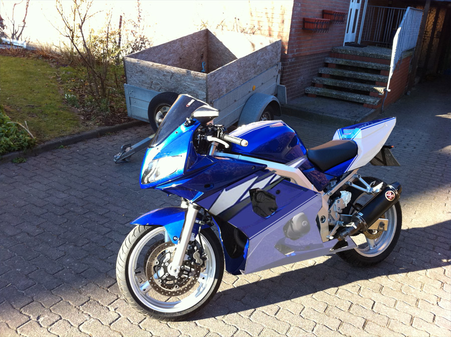 Leider muss ich wohl auf die eigentlich geplant gewesenen Folierungsarbeiten aus Kostengründen verzichten. Um die Maschine im Stil von Sorpe [übrigens eine wunderschöne Maschine!] ( http://www.svrider.de/index.php?seite=o ... tails=5124 ) folieren zu lassen, müsste ich wohl für die Folierung mehr bezahlen als für eine komplett Lackierung der Maschine in einer anderen Farbe 8O und da behaupte noch mal einer folieren sei günstiger als lackieren :( hell