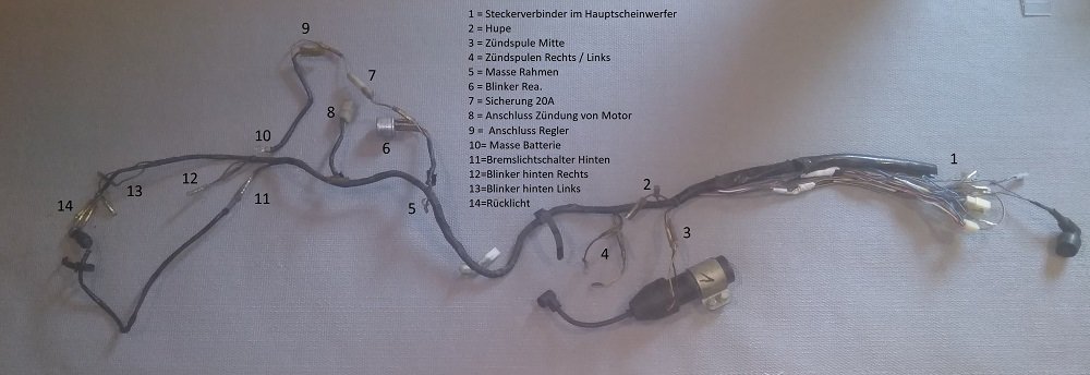 Jetzt schon mal den Gleichrichter und Blinker Relais an seinen Platz verbracht und mal grob den Kabelbaum im Rahmen verlegt.