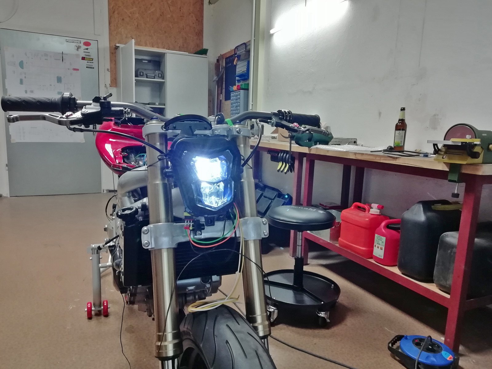 Der funktioniert prima und ohne Probleme (auch ohne eigenes Steuergerät, oder so). Selbst die Lichtausbeute kann sich sehen lassen für das kleine Teil. Allerdings ist ein Standlicht damit nicht möglich. Das heißt, wir werden dann wohl vorn Blinker mit Positionslichtern verwenden...
