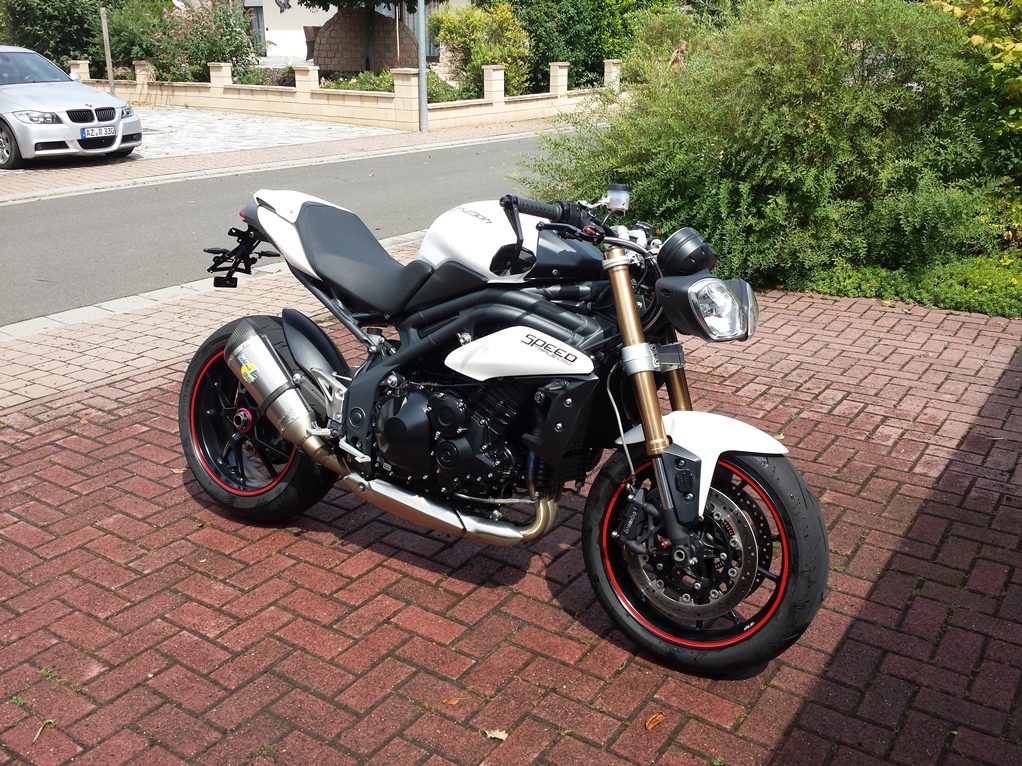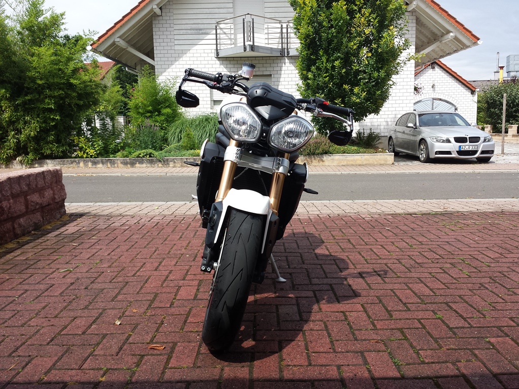 So, die Dicke ist wieder fahrbereit und gleich mit einigen Änderungen im Vergleich zu vor dem Crash versehen. Lenker der R, Lenkerendenspiegel und die Scheinwerfer-/Tachoeinheit sitzt dank Halterung der Street Triple jetzt tiefer.