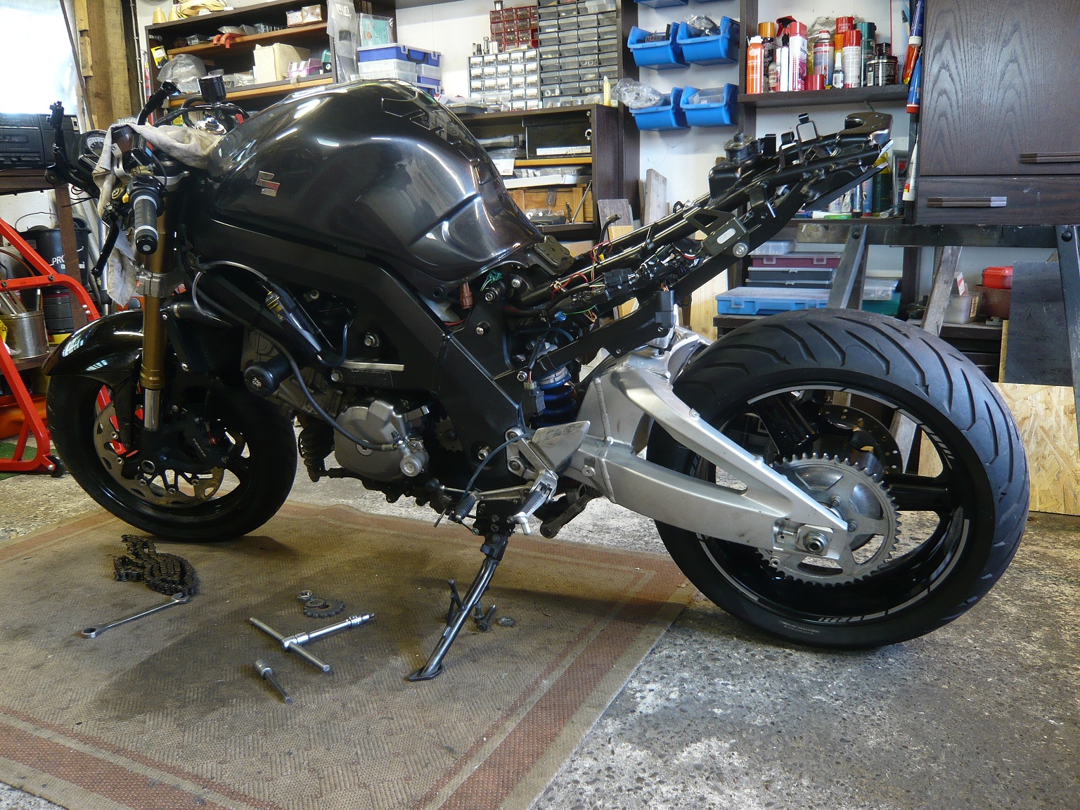 Heute wurde mal wieder ein bisschen gebastelt, nachdem ich heute Besuch vom DHL Mann bekam. Er überbrachte mir ein am 18.12 losgeschicktes Paket, welches eine Odyssee durchlebte, die selbst Homer beeindruckt hätte! Also wurde heute das gesamte Moped (Frontverkleidung, Heckverkleidung, Hinterrad, Schwinge und co) demontiert, um die GSR Schwinge mal provisorisch ranzuhalten und zu schauen, wo es passt und wo nicht. Dabei haben sich ein Großteil von Soulrebels Eindrücken bestätigt: Seitenständer macht minimale Probleme, Federbein und Krümmer passen, Kettenflucht ist keine Schwierigkeit, Werkzeug- und Batteriekasten muss rationalisiert werden. Das größte Problem stellt wohl der Heckrahmen dar, da dieser in der weniger steilen Alu Version mit der rechten Platte, an denen die Soziusrasten verschraubt wird an die Schwinge stößt. Entweder ich besorge mir einen K3 Stahl Heckrahmen und einen K3 Sitz, oder ich finde eine Möglichkeit, die Platten abzusägen und wenige Zentimeter weiter hinten wieder anzuschweißen. Im Moment tendiere ich zur letzteren Lösung.