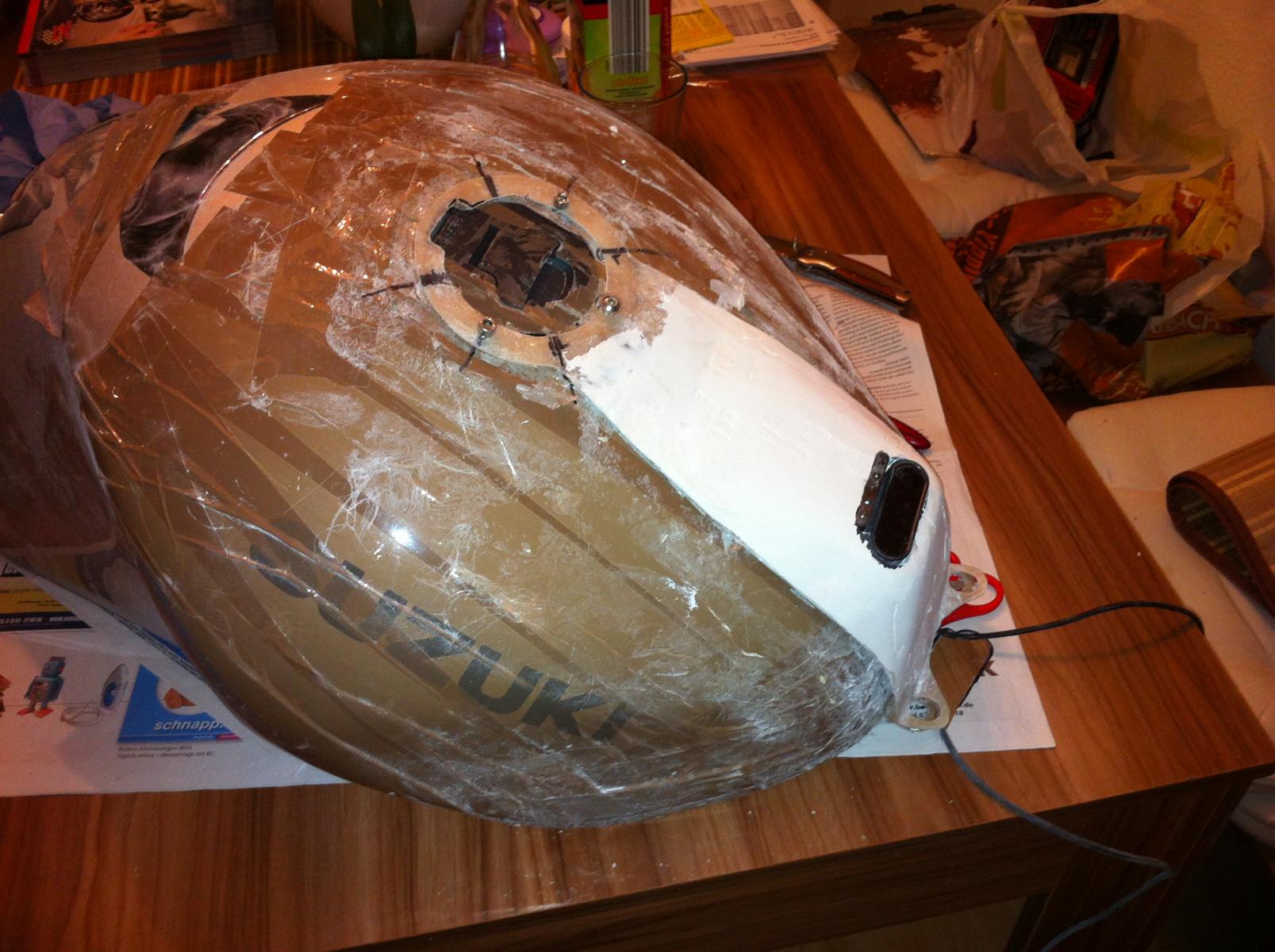 Zum Plan: Ein Gfk-Teil das von der Tankbefestigung vorne am Rahmen bis zum Tankdeckel verläuft herstellen.