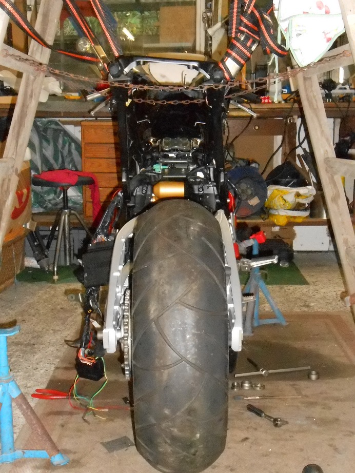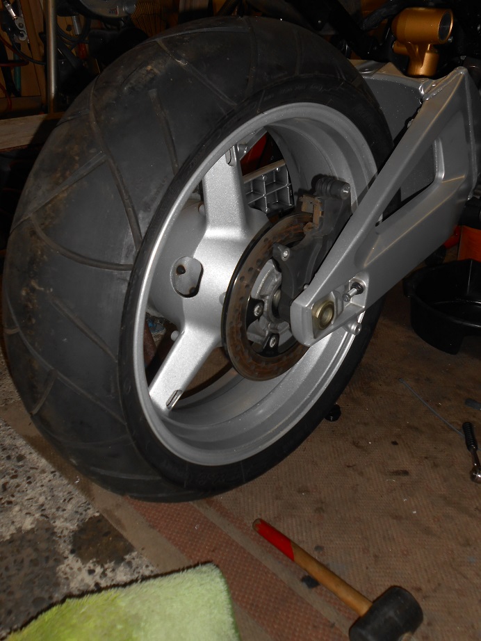 Und als krönenden Abschluss habe ich schließlich die SV100o Felge so grob eingepasst. Das sieht alles ganz gut aus. Das Hinterrad ist aber noch nicht genau "vermittelt" -- nur so ungefähr. Ich habe da auch zunächst die Bremsankerplatte der GSR600 raufgesteckt. Das wird aber so nicht passen (aVa hat's ja auch schon beschrieben): entweder muss eine andere (240mm) Bremsscheibe her oder ich passe einen Bremsanker der Kante an -- das weiss ich noch nicht so genau. Ich werde die Bremsankerplatte der K6 mal auf 25mm aufbohren lassen und dann schau ich mal, ob das mit der K6 Bremse geht -- Versuch macht klug.