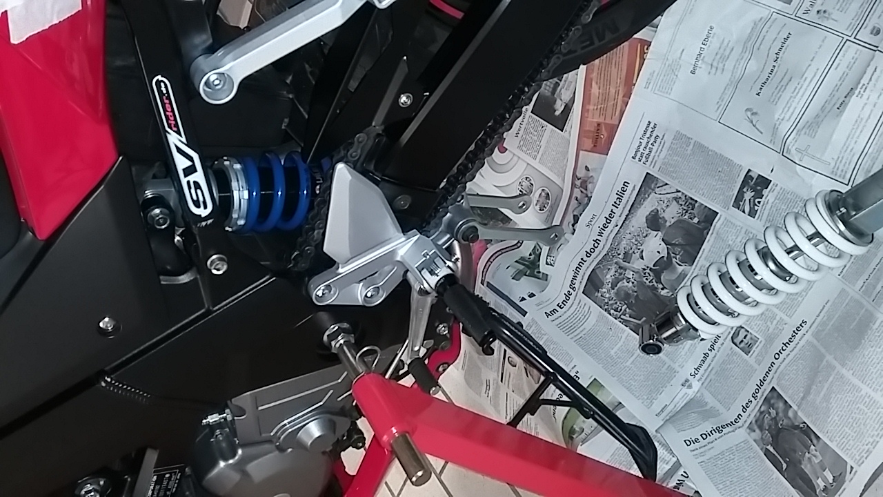 Ja bei nem Austauschfederbein, des extra für die SV gemacht ist, ist die Sache recht trivial. Sind wirklich nur drei Schrauben (oberer Umlenkhebel, Federbein unten &oben) ;)