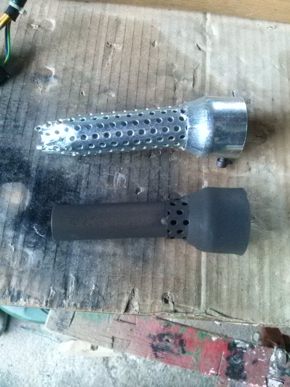 Der neue DB-Killer wartet auf seinen Einbau. Zum Vergleich mal der Verbliebene. Der wurde vom Vorbesitzer etwas gekürzt... Aus Mangel an Siebrohr im richtigen Durchmesser habe ich einfach ein Rohr anschweißen lassen und es hinten offen gelassen. Mal hören wie der Sound sich verändert. An sich ist das Ding echt billig gemacht. Nichts entgratet und auch am Ende einfach nur zusammen gequetscht. Ich überlege ernsthaft auf meine Leo´s umzubauen. Mal sehen ob meine Frau nochmal mitfährt, ansonsten mache ich das. Natürlich mit dem Krümmer meines an deren Bikes, mir dem Originalen sind mir die Leo-Töpfe zu lang. Aber dann geht das mit Sozia ja nicht mehr.