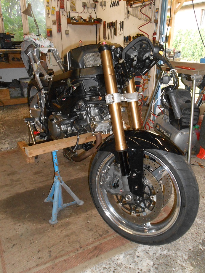 Auch das Vorderrad (GSXR, baugleich mit SV1000) passt einwandfrei, ohne jede Änderung in die Gabel (ist schon fast langweilig). Fender ist von einer Gsxr 1000 K7 -- aber die sind wohl alle so ziemlich untereinander tauschbar. Jetzt fehlt noch ein Lenker