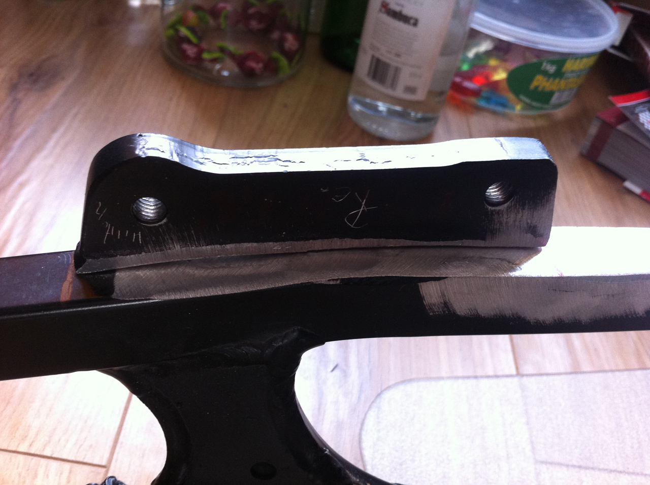 Das Problem mit dem Heckrahmen ab K4 besteht darin, dass beim vollen einfedern (habe ein Wilbers 640 drin, daher kann ich nicht direkt zum Original Federbein etwas sagen, aber da müsste es eigentlich genauso sein!) die rechte Fußrastenhalteplatte an die Schwinge stößt, allerdings nur mit der kleinen nach innen versetzten vorderen Ecke der Platte, nicht viel (vielleicht 0,5-1cm lang) aber zu viel zum Fahren! Hier haben wir uns dazu entschieden die Platten vom Heckrahmen beide abzutrennen und dann bündig mit dem äußeren Rand (vorher waren die da so schief angeschweißt) um ca 2cm nach hinten versetzt wieder anzuschweißen, damit das ganze symmetrisch und soziustauglich weiterhin bleibt.