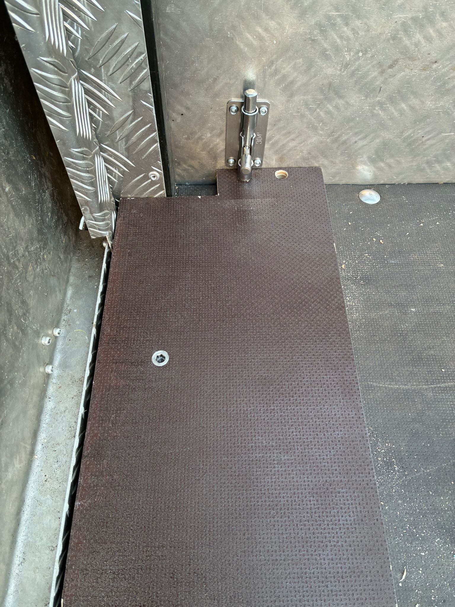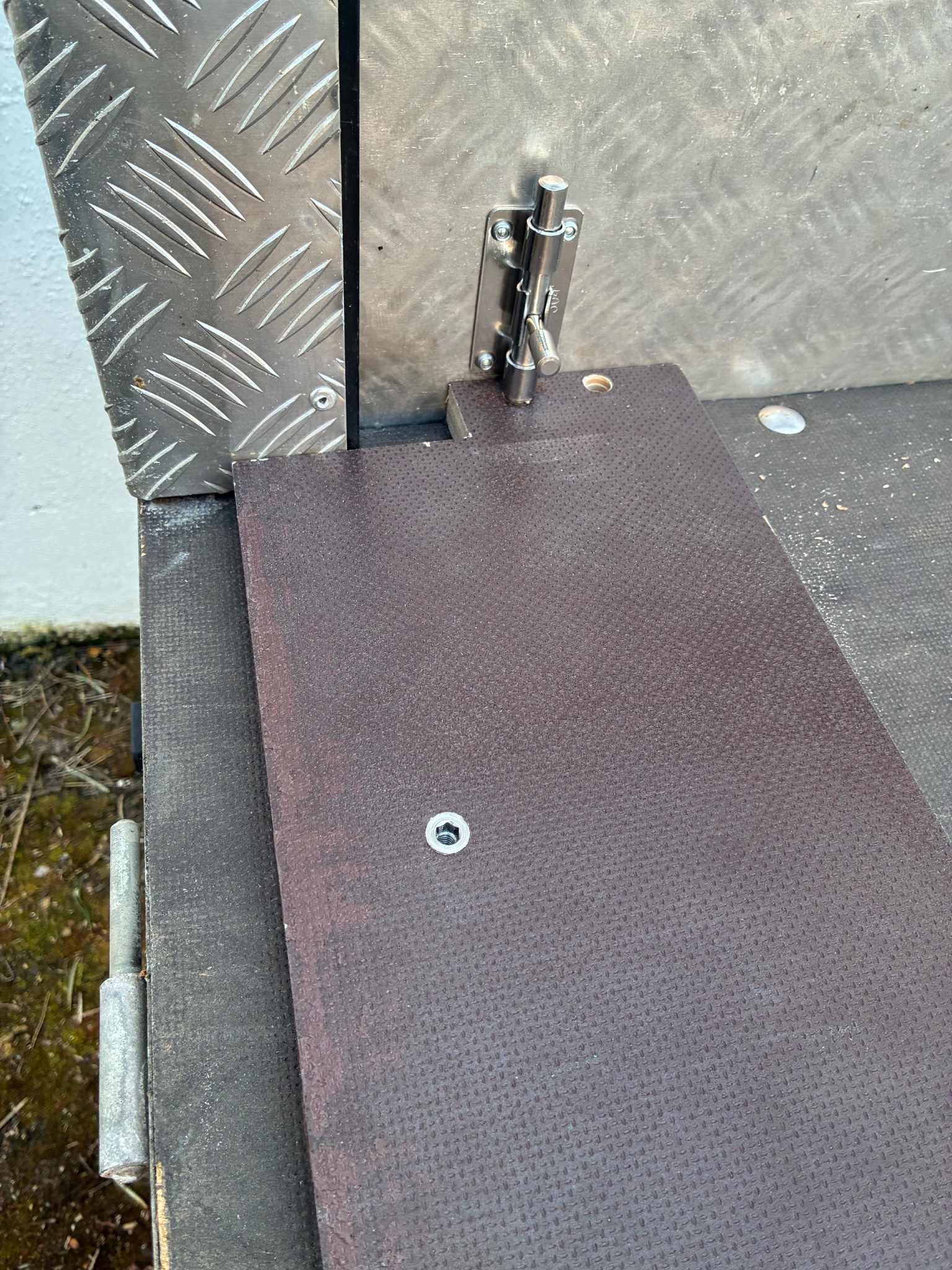 Da das Ausgleichsbrett das schießen der Heckklappe verhindert muss dieses verstellbar sein. An der jeweiligen Position wird es durch den Riegel gehalten welchen ich an der Seite mit Popnieten befestigt habe. Die eingelassene Gewindebuchse ist damit die Rampe nicht verrutschen kann.