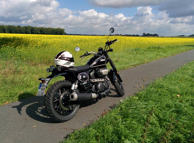 Die SCR hat einen schönen Motor, den merkt man wenigstens. Kann man was draus machen. Sitzposition fand ich zu hoch. Tacho passt überhaupt nicht zu dem Konzept. Fährt sich easy, aber die Rasten setzen früh auf.