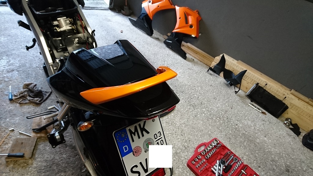 Wenn die Soziusabdeckung auch noch Orange wäre, würde das die Linie von Tank und Verkleidung perfekt fortsetzen.