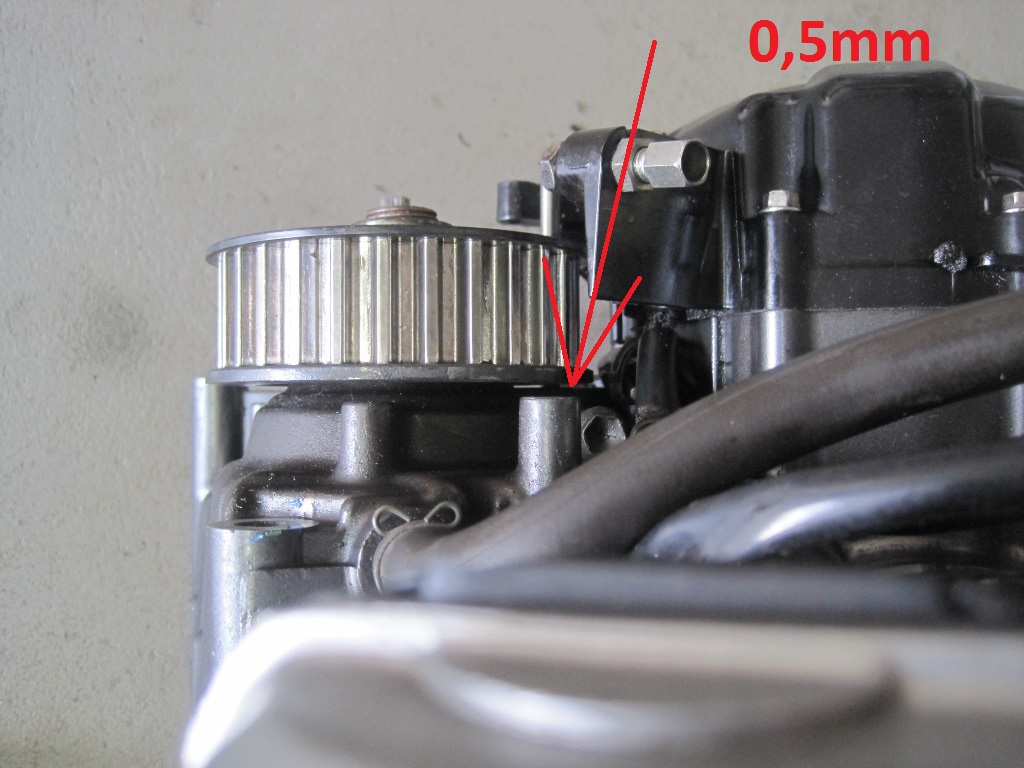 Beim Einbau des Teil in den neuen Motor klemmte die Riemenscheibe. Sie läuft/lief so dicht am Kurbelgehäuse vorbei, das beim neuen Motor kein Spiel (minimal andere Position der Getriebewelle) mehr war und klemmte. Habe die Buchse hinterm Ritzel damals exakt 4mm gekürzt. Hab jetzt eine andere um 3,3mm gekürzt, jetzt ist wieder genug Platz dahinter...