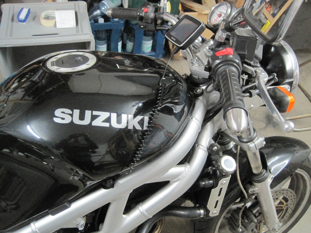 Hab den Tank für die Urlaubstour an der Stelle mit nem Streifen schwarzen Isolierband getunt. Sonst brauch ich das Navi am Mopped äusserst selten.