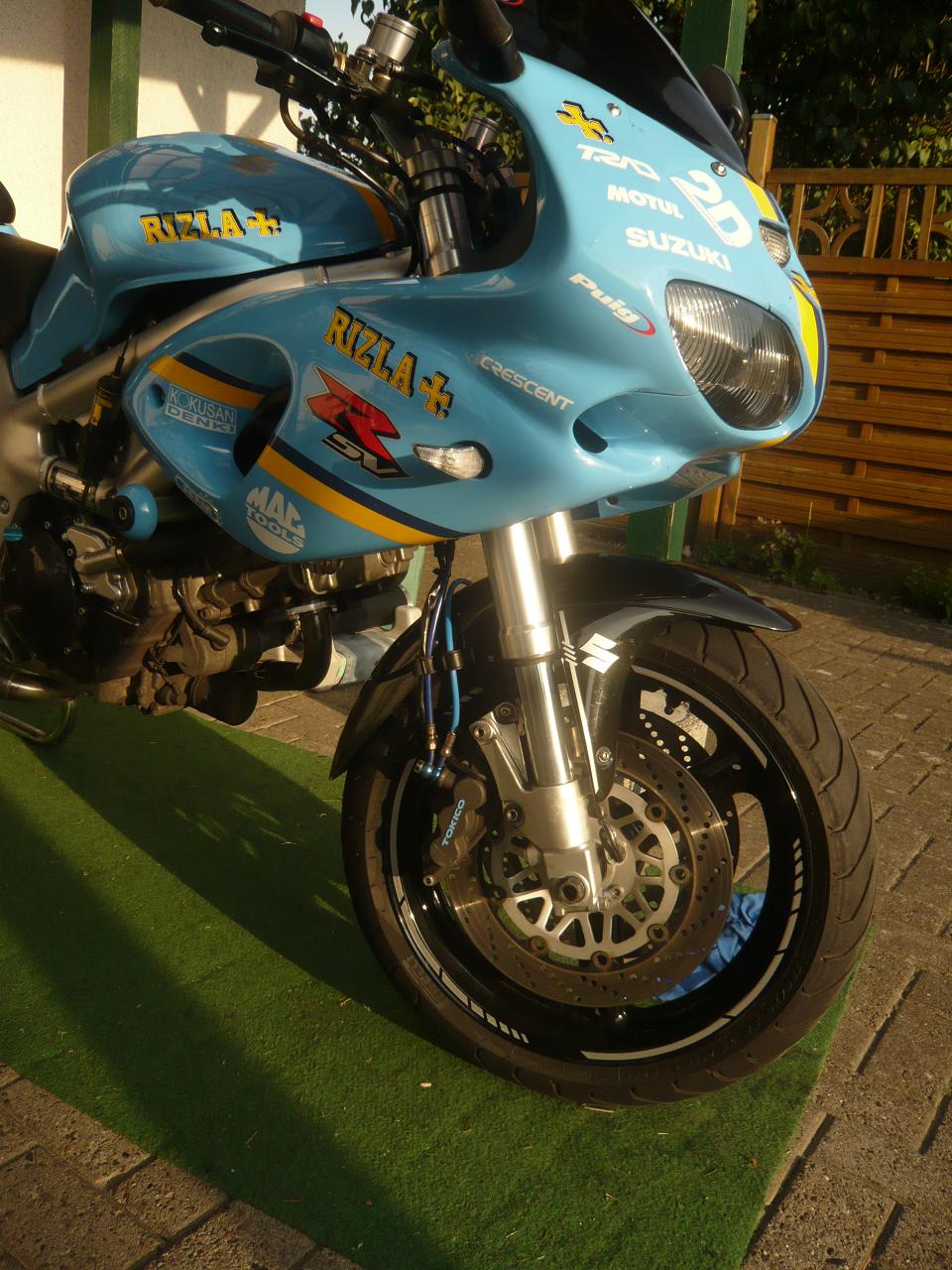 Der Frontfender ist "Schwarz/Metallic" --> mit dezentem Metallicton, die Aufkleber sind alles Silber. Den Fender hellblau zu machen sieht m.E. nicht so gut aus. Ich hatte den Fender der SV-Gabel in hellblau Rizla-Desing lackiert, so in schwarz finde ich es besser. Vielleicht finde ich da noch ein Bild.