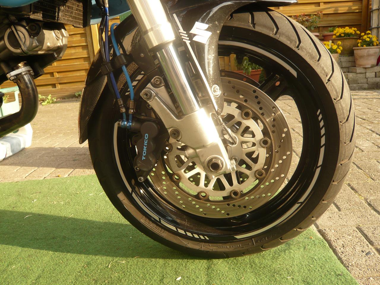 Die BRemsleitungen haben unterschiedlichen Blauton (Hellblau/Dunkelblau) war Zufall, passt aber gut zu den Blautönen am Mopped :mrgreen: