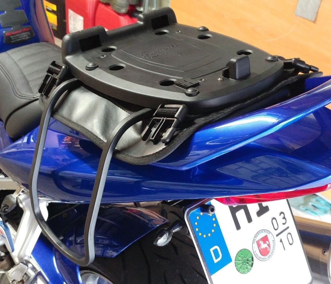 Zum einen gibt es eine Austauschhalterung für den Soziussitz, die für TopCase optimiert ist, und denn die Eigenbauvariante hier im Forum, nach mM handwerklich gut gemacht. Und wenn der Sitz eine Sozia aushält, sollte das mit Gepäck auch hinhauen.