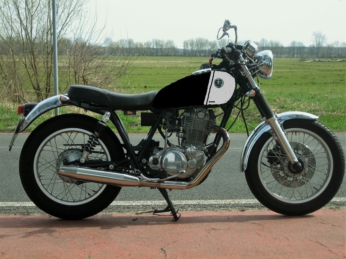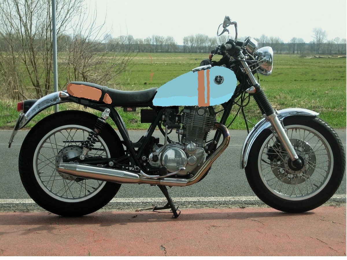 Mal eine Idee, durch Lackierung die Formlinie etwas zu entzerren. Durch die langen Kotflügel und die Längslackierung des Tanks wirkt die SR sehr gestreckt. Vielleicht kann man das durch eine neue Farbgebung etwas breiter machen...Dann noch den Sattler bemühen, könnte ich mir gut vorstellen. Am Heck kommt dann noch das Lucas-Rücklicht
