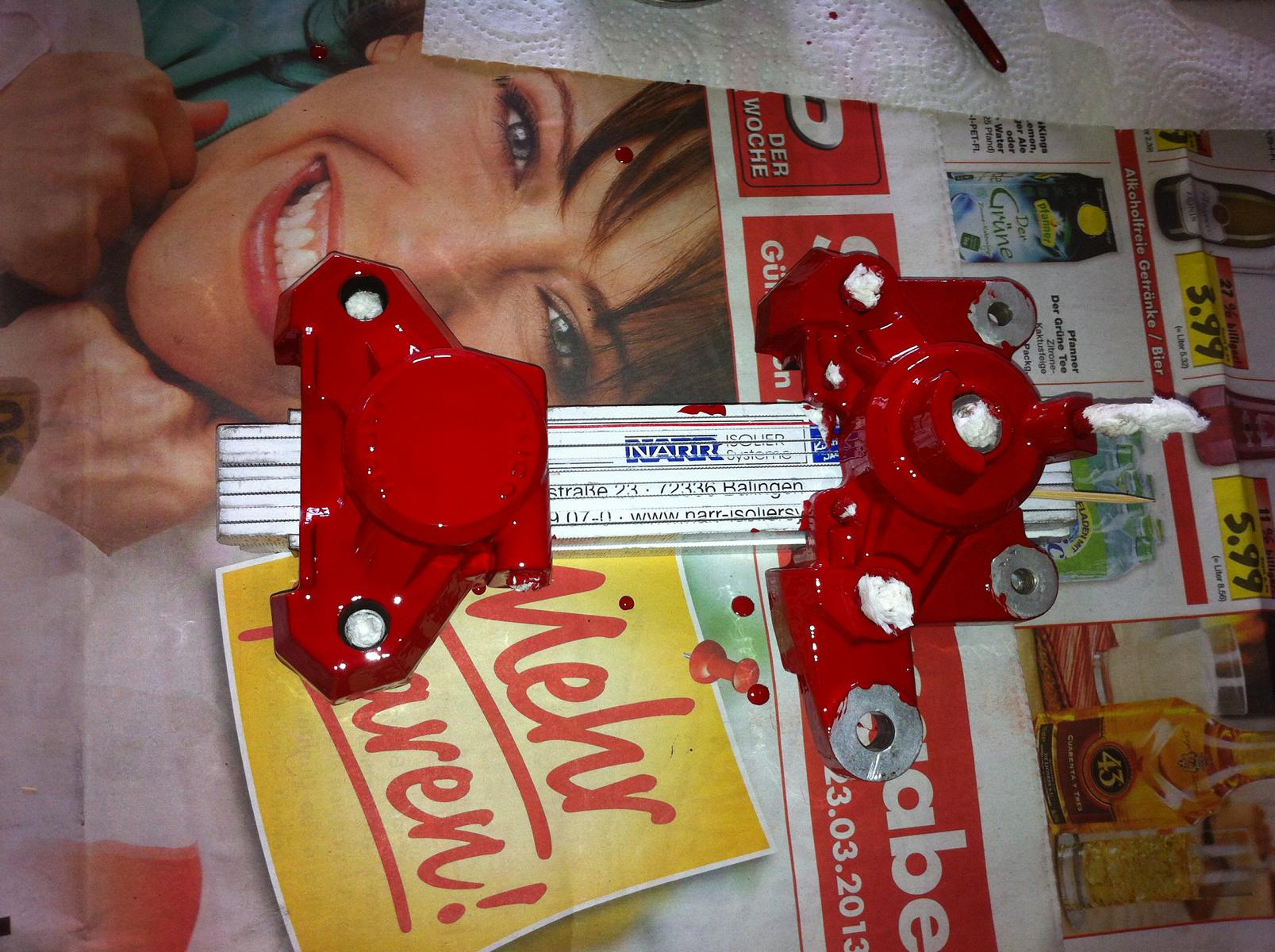 Glei am morgen die bremssättel lackiert Dann die komplette Front wieder zusammengebaut,Schloss,Scheinwerfer etc wieder dran.