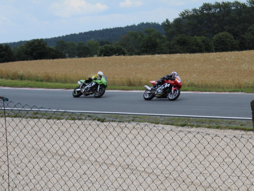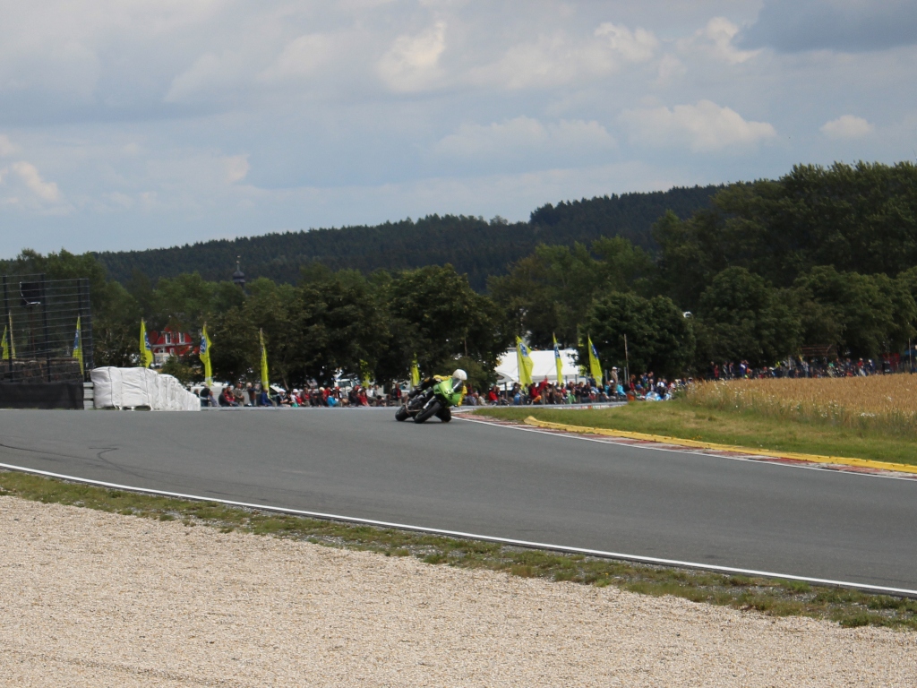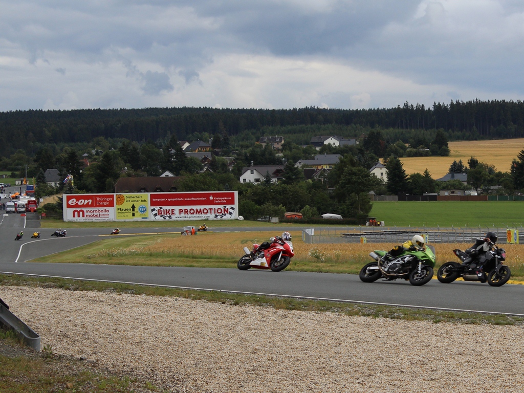 Dann ging es runter Richtung Dorf. Stark bremsen. Vom 6. Gang in den 3. Runter, spitz anfahren (mittig und außen waren Bodenwellen) und kurz beschleunigen, bremsen, dann eine rechts links Schikane an der Tribüne vorbei und mit Vollgas aus der Kurve, durchbeschleunigen und die Senke runter. Hier konnte ich an Johannes (#516) und Andreas (#576) vorbei beschleunigen. Die Senke ist meiner Meinung das härteste Stück in Schleiz. Bei Vollgas, um die 200 km/h, ein Rechtsbogen und kurz mit dem Knie am Boden musst du die Maschine nach links umlegen. Unglaublich was man da für Kräfte braucht. Aber es ist GEIL :-) Nach der schnellen Links geht’s wieder rechts rum auf eine „Spitzkehre“ zu. Ankern wie blöd bis in den 2. Gang runter, um die Kehre und wieder Gas. Es geht über einen Hubbel, das Vorderrad wird kurz leicht und weiter auf die letzte rechts links Schikane zu bevor es wieder auf die Start / Ziel geht. Vor mir Ingo (#582), an den ich mich ransaugte, bremsen, ich komme näher, durch die Kombination durch, er macht ein paar Meter gut, doch ich komme mit mehr Schwung aus der Kurve und schaffe es auf der Start / Ziel aus dem Windschatten heraus an ihm vorbei zu gehen. Runde zwei und ich liege auf Platz 17. Der nächste, den ich sehe, ist Kai (#542). Er ist dieses Rennwochenende auf einer geliehen SV unterwegs. Er wollte sie mal testen, da er mit seiner ER6rr nur Probleme hatte. Kai ist richtig gut unterwegs, dafür dass er das erste Mal auf einer SV ein Rennen bestreitet. Ich bleibe die gesamte 2. Runde an ihm dran.